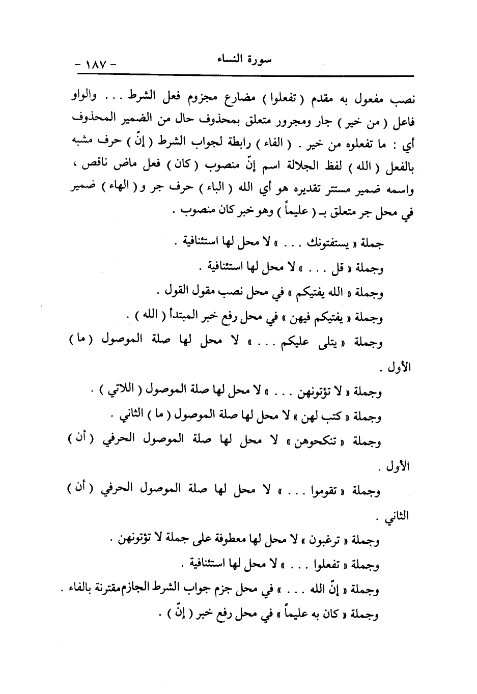 منصوب وعلامة النصب الفتحة المقدّرة على الألف (بإذن الله) مثل الأولى والجارّ والمجرور متعلّق ب (أحيي) ، (الواو) عاطفة (أنبئ) مثل أخلق و (كم) ضمير مفعول به (الباء) حرف جرّ (ما) اسم موصول مبنيّ في محلّ جرّ متعلّق ب (أنبّئكم) ، (تأكلون) مضارع مرفوع.. والواو فاعل (الواو) عاطفة (ما تدّخرون) مثل ما تأكلون (في بيوت) جارّ ومجرور متعلّق ب (تدّخرون) ، و (كم) ضمير مضاف إليه. (إنّ) حرف مشبّه بالفعل (في) حرف جرّ (ذا) اسم إشارة مبنيّ في محلّ جرّ متعلّق بمحذوف خبر إنّ و (اللام) للبعد و (الكاف) للخطاب (اللام) لام الابتداء للتوكيد (آية) اسم إنّ منصوب (لكم) مثل الأول متعلّق بمحذوف نعت لآية (إن) حرف شرط جازم (كنتم) فعل ماض ناقص مبنيّ على السكون في محلّ جزم فعل الشرط.. (وتم) ضمير اسم كان (مؤمنين) خبر كان منصوب وعلامة النصب الياء.