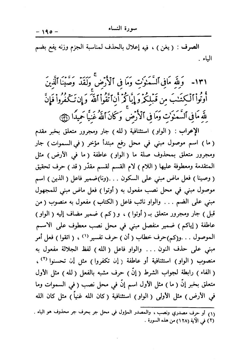 (إذ) اسم ظرفيّ مبنيّ في محلّ نصب مفعول به لفعل محذوف تقديره اذكر (قال) فعل ماض (الله) لفظ الجلالة فاعل مرفوع (يا) أداة نداء (عيسى) منادى مفرد علم مبنيّ على الضمّ المقدّر على الألف في محلّ نصب (انّ) حرف مشبّه بالفعل (الياء) ضمير في محلّ نصب اسم إنّ (متوفّي) خبر إنّ مرفوع وعلامة الرفع الضمّة المقدّرة على الياء و (الكاف) ضمير مضاف إليه (الواو) عاطفة (رافعك) مثل متوفّيك بالعطف عليه (إلى) حرف جرّ و (الياء) ضمير في محلّ جرّ متعلّق برافع (الواو) عاطفة (مطهّرك) مثل متوفّيك بالعطف عليه (من) حرف جرّ (الذين) اسم موصول مبنيّ في محلّ جرّ متعلق بمطهّر (كفروا) فعل ماض مبنيّ على الضمّ.. والواو فاعل (الواو) عاطفة «1» ، (جاعل) معطوف على متوفّيك مرفوع مثله (الذين) في محلّ جرّ مضاف إليه (اتّبعوا) مثل كفروا و (الكاف) ضمير مفعول به (فوق) ظرف مكان منصوب متعلّق بمحذوف مفعول به ثان لجاعل (الذين) مثل السابق (كفروا) مثل الأول (إلى يوم) جارّ ومجرور متعلّق بجاعل، (ثمّ) حرف عطف (إليّ) مثل الأول