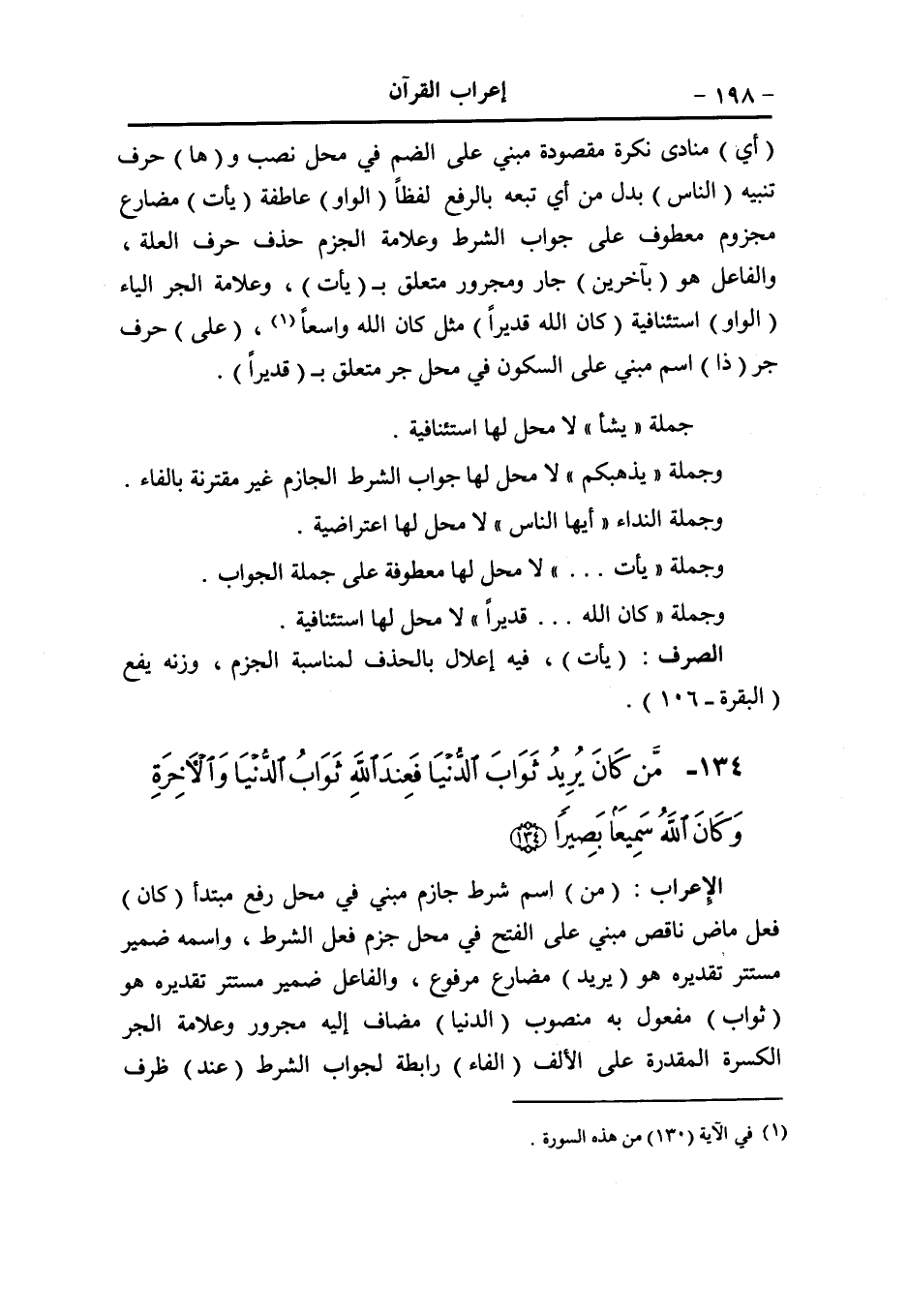 والواو فاعل (الصالحات) مفعول به منصوب وعلامة النصب الكسرة (الفاء) رابطة لجواب الشرط (يوفّي) مضارع مرفوع وعلامة الرفع الضمّة المقدّرة و (هم) ضمير مفعول به، والفاعل ضمير مستتر تقديره هو (أجور) مفعول به ثان منصوب و (هم) ضمير مضاف إليه (الواو) استئنافيّة، (الله) لفظ الجلالة مبتدأ مرفوع (لا) نافية (يحبّ) مضارع مرفوع، والفاعل ضمير مستتر تقديره هو، (الظالمين) مفعول به منصوب وعلامة النصب