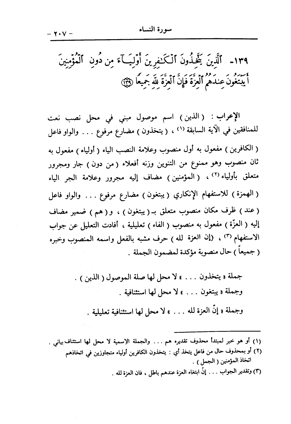 (الواو) عاطفة (لا) نافية (نشرك) مضارع منصوب معطوف على (نعبد) ، والفاعل نحن (الباء) حرف جرّ و (الهاء) ضمير في محلّ جرّ متعلّق (نشرك) ، (شيئا) مفعول به منصوب (الواو) عاطفة (لا) نافية (يتّخذ) مضارع منصوب معطوف على (نعبد) ، (بعض) فاعل مرفوع و (نا) ضمير متّصل مضاف إليه (بعضا) مفعول به أوّل منصوب (أربابا) مفعول به ثان منصوب (من دون) جارّ ومجرور متعلّق بمحذوف نعت لأرباب (الله) لفظ الجلالة مضاف إليه. (الفاء) استئنافيّة (إن تولّوا) مرّ إعرابها في الآية السابقة (الفاء) رابطة لجواب الشرط (قولوا) فعل أمر مبنيّ على حذف النون.. والواو فاعل (اشهدوا) مثل قولوا (الباء) حرف جرّ (أنّ) حرف مشبّه بالفعل و (نا) ضمير اسم أنّ في محلّ نصب (مسلمون) خبر أنّ مرفوع وعلامة الرفع الواو.
