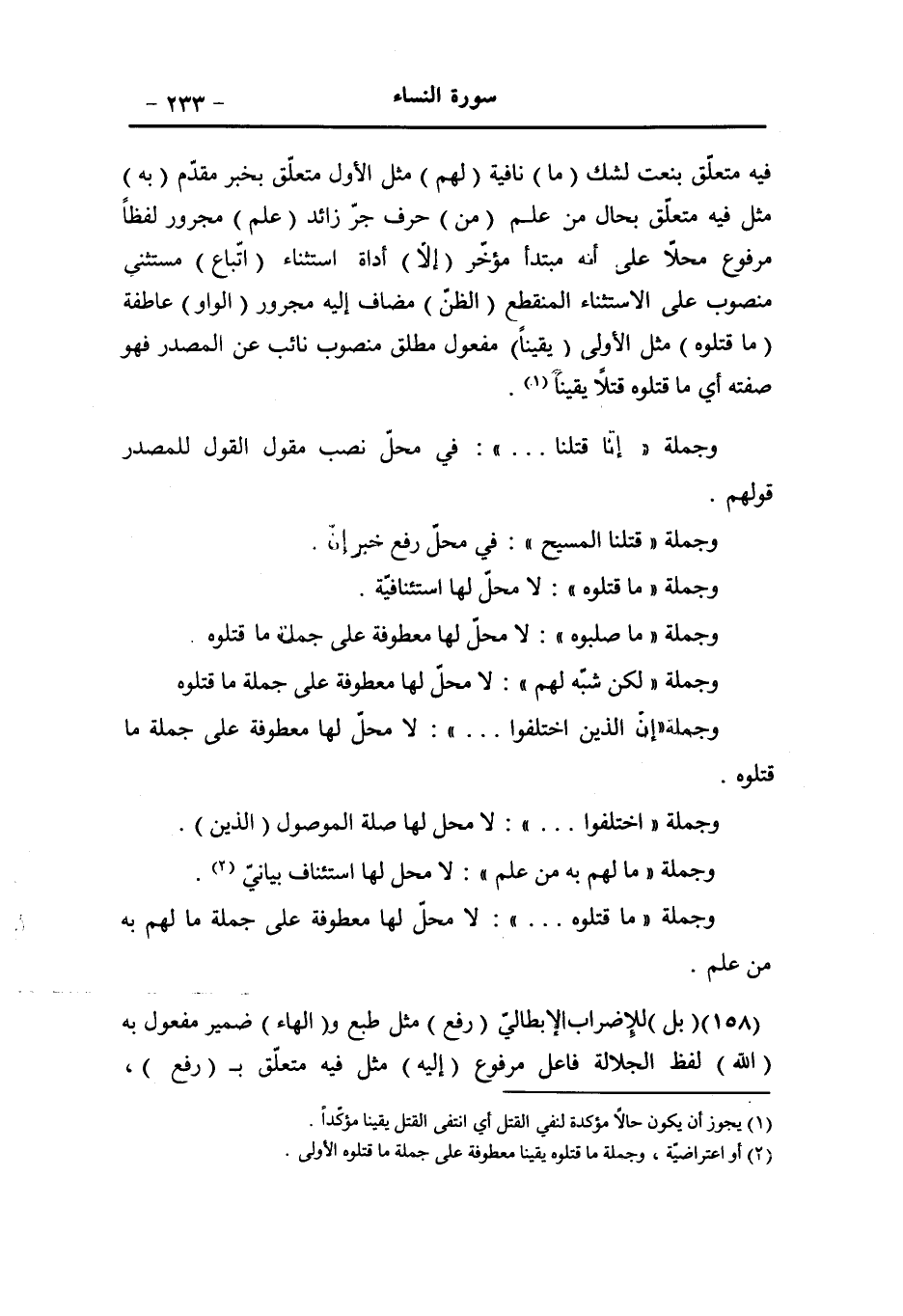 (1) أظهر أبو حيّان على هذا الإعراب بعض التحفّظ فقال: «وفيه- أي هذا التقدير- فيه خدش لطيف جدا لأن المقدّر يجب أن يكون من جنس المثبت ومتعلّقات هذا هي متعلّقات ذاك وهذا لا يستقيم مع جملة جاءكم رسول المعطوفة على جملة آتيتكم إذ ليس فيها ضمير يعود على اسم الشرط.. فإن كان الجواب هنا من غير جنس جواب القسم فكيف يدلّ عليه جواب القسم..