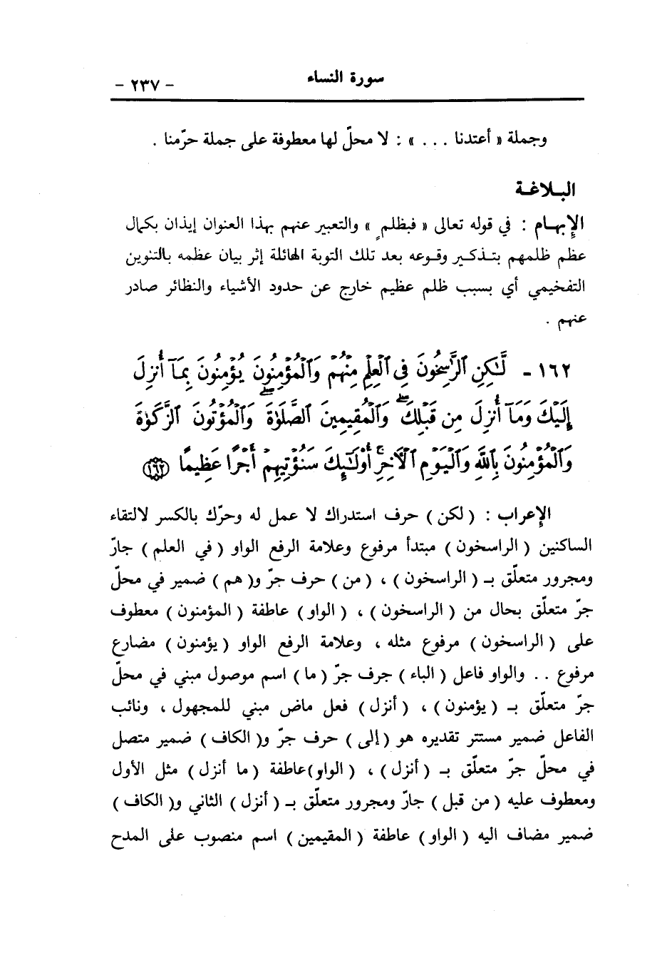(على) حرف جرّ و (نا) ضمير في محلّ جرّ متعلّق ب (أنزل) ، (الواو) عاطفة (ما) مثل الأول ومعطوف عليه (أنزل على) مثل الأولى (إبراهيم) اسم مجرور وعلامة الجرّ الفتحة متعلّق ب (أنزل) ، (إسماعيل، إسحاق، يعقوب، الأسباط) أسماء معطوفة على إبراهيم بحروف العطف مجرورة مثله (الواو) عاطفة (ما) اسم مثل الأول ومعطوف عليه (أوتي) مثل أنزل (موسى) نائب فاعل مرفوع وعلامة الرفع الضمّة المقدّرة على الألف (الواو) عاطفة في الموضعين (عيسى، النبيّون) اسمان معطوفان على موسى مرفوعان مثله وعلامة الرفع الضمّة المقدّرة والواو على التوالي (من ربّ) جارّ ومجرور متعلّق بمحذوف حال من الضمير المقدّر في (أوتي) أي ما أوتيه موسى ... منزلا من ربّهم «1» ، و (هم) ضمير مضاف إليه (لا) نافية (نفرّق) مضارع مرفوع والفاعل ضمير مستتر تقديره نحن (بين) ظرف مكان منصوب متعلّق ب (نفرّق) ، (أحد) مضاف إليه مجرور (من) حرف جرّ و (هم) ضمير في محلّ جرّ متعلّق بمحذوف نعت لأحد (الواو) عاطفة (نحن) ضمير منفصل في محلّ رفع مبتدأ (اللام) حرف جرّ و (الهاء) ضمير في محلّ جرّ متعلّق ب (مسلمون) وهو خبر المبتدأ مرفوع وعلامة الرفع الواو.