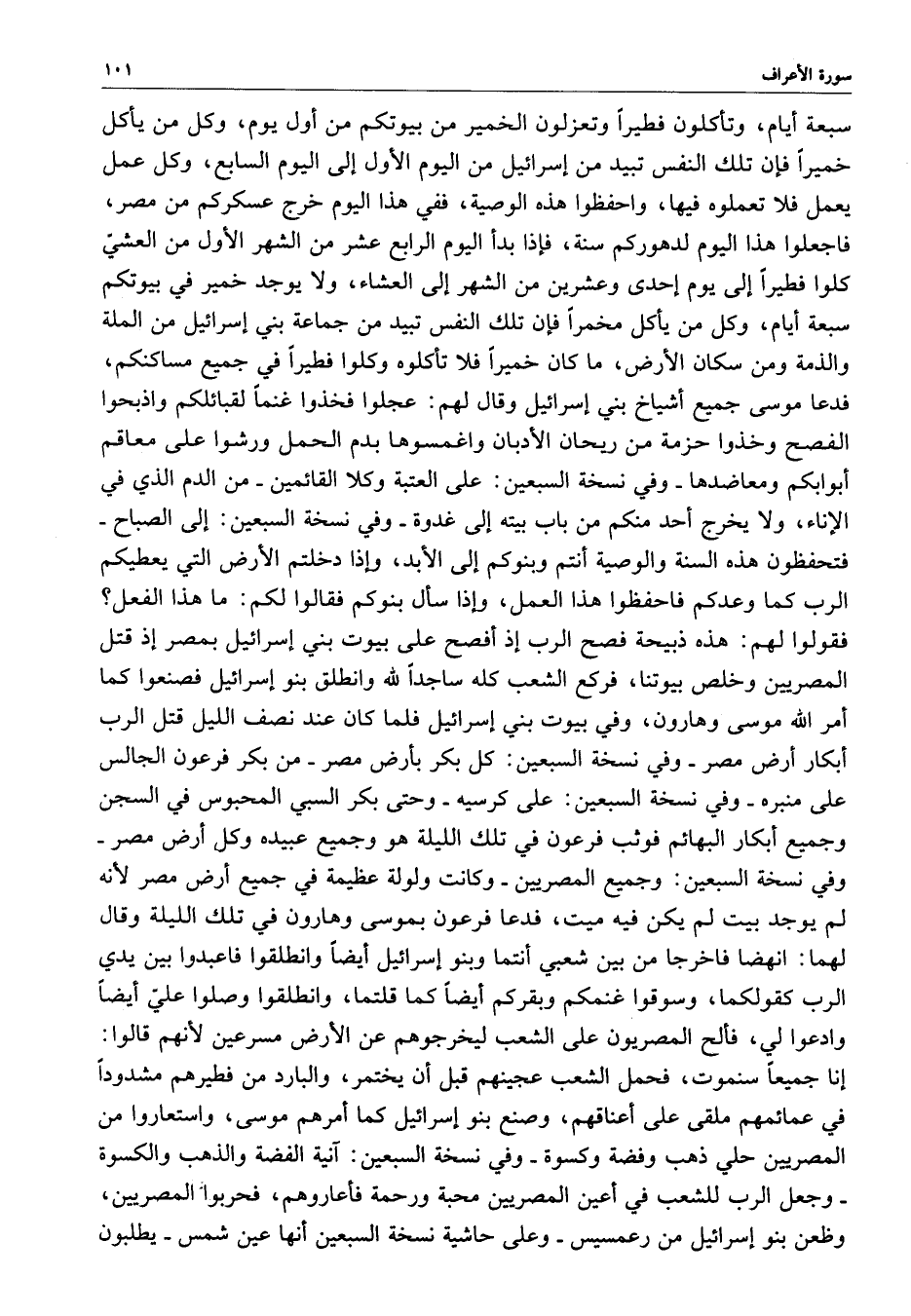 سبعة أيام ، وتأكلون فطيراً وتعزلون الخمير من بيوتكم من أول يوم ، وكل من يأكل خميراً فإن تلك النفس تبيد من إسرائيل من اليوم الأول إلى اليوم السابع ، وكل عمل يعمل فلا تعملوه فيها ، واحفظوا هذه الوصية ، ففي هذا اليوم خرج عسكركم من مصر ، فاجعلوا هذا اليوم لدهوركم سنة ، فإذا بدأ اليوم الرابع عشر من الشهر الأول من العشيّ كلوا فطيراً إلى يوم إحدى وعشرين من الشهر إلى العشاء ، ولا يوجد خمير في بيوتكم سبعة أيام ، وكل من يأكل مخمراً فإن تلك النفس تبيد من جماعة بني إسرائيل من الملة والذمة ومن سكان الأرض ، ما كان خميراً فلا تأكلوه وكلوا فطيراً في جميع مساكنكم ، فدعا موسى جميع أشياخ بني إسرائيل وقال لهم : عجلوا فخذوا غنماًُ لقبائلكم واذبحوا الفصح وخذوا حزمة من ريحان الأدبان واغمسوها بدم الحمل ورشوا على معاقم أبوابكم ومعاضدها - وفي نسخة السبعين : على العتبة وكلا القائمين - من الدم الذي في الإناء ، ولا يخرج أحد منكم من باب بيته إلى غدوة - وفي نسخة السبعين : إلى الصباح - فتحفظون هذه السنة والوصية أنتم وبنوكم إلى الأبد ، وإذا دخلتم الأرض التي يعطيكم الرب كما وعدكم فاحفظوا هذا العمل ، وإذا سأل بنوكم فقالوا لكم : ما هذا الفعل ؟ فقولوا لهم : هذه ذبيحة فصح الرب إذ أفصح على بيوت بني إسرائيل فصنعو ا كما أمر الله موسى وهارون ، وفي بيوت بني إسرائيل فلما كان عند نصف الليل قتل الرب أبكار أرض مصر - وفي نسخة السبعين : على كرسيه - وحتى بكر السبي المحبوس في السجن وجميع أبكار البهائم فوثب فرعون في تلك الليلة هو وجميع عبيده وكل أرض مصر لنه لم يوجد بيت لم يكن فيه ميت ، فدعا فرعون بوسى وهارون في تلك الليلة وقال لهما : انهضا فاخرجا من بين شعبي أنتما وبنو إسرائيل أيضاً وانطلقوا فاعبدوا بين يدي الرب كقولكما ، وسوقوا غنمكم وبقركم أيضاً قلتما ، وانطلقوا وصلوا عليّ أيضاً وادعوا ير ، فألح المصريون على الشعب ليخروجهم عن الأرض مسرعين لأنهم قالوا : إنا جميعاً سنموت ، فحمل الشعب عجينهم قبل أن يختمر ، والبارد من فطيرهم مشدوداً في عمائمهم ملقى أعناقهم ، وصنع بنو إسرائيل كما أمرهم موسى ، واستعاروا من المصريين حلي ذهب وفضة وكسوة - وفي نسخة السبعين : آنية الفضة والذهب والكسوة - وجعل الرب للشعب في أعين المصريين محبة ورحمة فاعارهم ، فحروا المصريين ، وظعن بنو إسرائيل من رعمسيس - وعلى حاشية نسخة السبعين أنها عين شمس - يطلبون