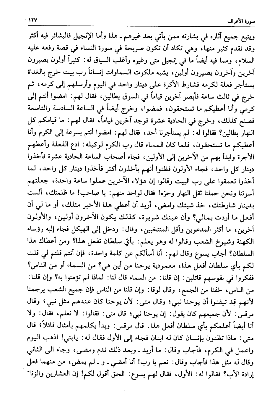ويتبع جميع آثاره في بشارته ممن يأتي بعد غيرهم - هذا وأما الإنجيل فالبشارة فيه أكثر وقد تقدم كثير منها ، وهي تكاد أن تكون صريحة في سورة النساء في قصة رفعه عليه السلام ، مما فيه أيضاً ما في إنجيل متى وغيره وأغلب السياق له : كثيراً أولون يصيرون آخرون وآخرون يصيرون أولين ، يشبه ملكوت السماوات إنساناً رب بيت حرج بالغداة يستأخر فعلة الكرمه فشارط الأكرة على دينار واحد في اليوم وأرسلهم إلى كرمه ، ثم خرج في ثالث ساعة فأبصر آخرين قياماً في السوق بطالين ، فقال لهم : امضوا أنتم إلى كرمي وأنا أعطيكم ما تستحقون ، فمضوا خرج أيضاً في الساعة السادسة والتاسعة فصنع كذلك ، وخرج في الحادية عشرة فوجد آخرين قياماً فقال لهم : ما قيامكم كل النهار بطالين ؟ فقالوا له : لم يستأجرنا أحد ، فقال لهم : امضوا أنتم بسرعة إلى الكرم وانا اعطيكم ما تستحقون ، فلما كان المساء قال رب الكرم لوكيله : ادع الفعلة وأعطهم الأخرة وابدأ بهم من الآخرين إلى الأولين ، فجاء أصحاب الساعة الحادية عشرة فأخذوا دينار كل واحد ، فجاء الأولون فظنوا أنهم يأخذون أكثر فأخذوا دينار كل واحد ، لما أخذوا تعمقوا على رب البيت وقالوا إن هؤلاء الآخرين عملوا ساعة واحدة ، جعلتهم أسوتنا ونحن حملنا ثقل النهار وحرّه فقال لواحد منهم : ياصاحب ما ظلمتك ، ألست بدينار شارطتك ، خذ شيئك وامض ، أريد أن أعطي هذا الأخير مثلك ، أو ما لي أن افعل ما أردت بمالي ؟ وأن عينك شريره ، كذلك يكون الآخرون اولين ، والأولون آخرين ، ما أكثر المدعوين وأقل المنتخبين ، وقال : ودخل إلى الهيكل فجاء إليه رؤساء النكهة وشيوخ الشعب وقالوا له وهويعلم : بأيّ سلطان تغعل هذا ؟ ومن اعطاك هذا السلطان ؟ اجاب يسوع وقال لهم : أنا أسألكم عن كلمة واحدة ، فإن أنتم قلتم لي قلت لكم بأي سلطان أفعل هذا ، معمودية يوحنا من اين هي ؟ من السماء أو من الناس ؟ ففكروا في نفوسهم قائلين : إن قلنا : من السماء قال لنا : لماذا لم تؤمنوا به ؟ وإن قلنا : من الناس ، خفنا من الجمع ، وقال لوقا : وإن قلنا من الناس فإن جميع الشعب يرجمنا لأنهم قد تيقنوا أن يوحنا نبي ؛ وقال لوقا : وإن قلنا من الناس فإن جميع الشعب يرجمنا لأنهم قد تيقنوا أن يوحنا نبي ؛ وقال متى : لأن يوحنا كان عندهم مثل نبي ؛ وقال مرقسس : لأن جميعهم كان يقول : إن يوحنا نبي ؛ قال متى فقالوا : لا نعلم ، فقال ، وقال أنا أيضاً اعلمكم باي سلطان أفعل هذا .