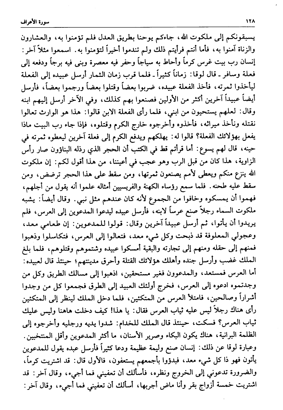 وقال أيضاً : يشبه ملكوت السماء رجلاً صنع عرساً لابنه ، فأرسل عبيده ليدعوا المدعوين إلى العرس ، فلم يريدوا أن ياتوا ، ثم أرسل عبيداً آخرين وقال : قولوا المدعوين : إن طعا مي معد ، وعجولي المعلوفة قد ذبحت وكل شيء معد ، فتعالوا إلى العرس ، فتكاسلوا وذهبوا فمنهم إلى حقله ومنهم إلى تجارته والبقية أمسكوا عبيده وشتموهم وقتلوهم ، فلما أبلغ الملك غضب وأرسل جنده واهلك هؤلائك القتله واحرق مدينتهم ؛ حينئذ قال لعبيده : أما العرس فمستعد ، والمدعوون فغير مستحق ، اذهبوا إلى مسالك الطريق وكل من وجدوا أشراراً وصالحين ، فامتلأ العرس من المتكئين ، فلما دخل الملك لينظر إلى المتكئين ، فلما دخل الملك لينظر إلى المتكئين رأى هناك رجلاً ليس عليه ثياث العرسفقال : يا هذا كيف دخلت هاهنا وليس عليك ثياب العرس ؟ فسكت ، حينئذ قال الملك للخدام : شدوا يديه ورجليه وأخرجوه إلى الظلمة البرانية ، هناك يكون البكاء وصرير الأسنان ، ما أكثر المدعوين وأقل المنتخبين وعبارة لوقا عن ذلك : إنسان صنع وليمه عظيمه ودعا كثيراً فأرسل عبده يقول للمدعوين يأتون فهو ذا كل شيء معد ، فبدؤوا بأجمعهم يستعفون ، فالأول قال : قد اشتريت كرماً والضرورة تدعوني إلى الخروج ونظره ، فاسألك أن تعفني فما أجيء ، وقال آخر : قد اشتريت خمسة أزواج بقر وأنا ماض أجربها ، أسألك أن تعفيني فما أجيء ، وقال آخر :