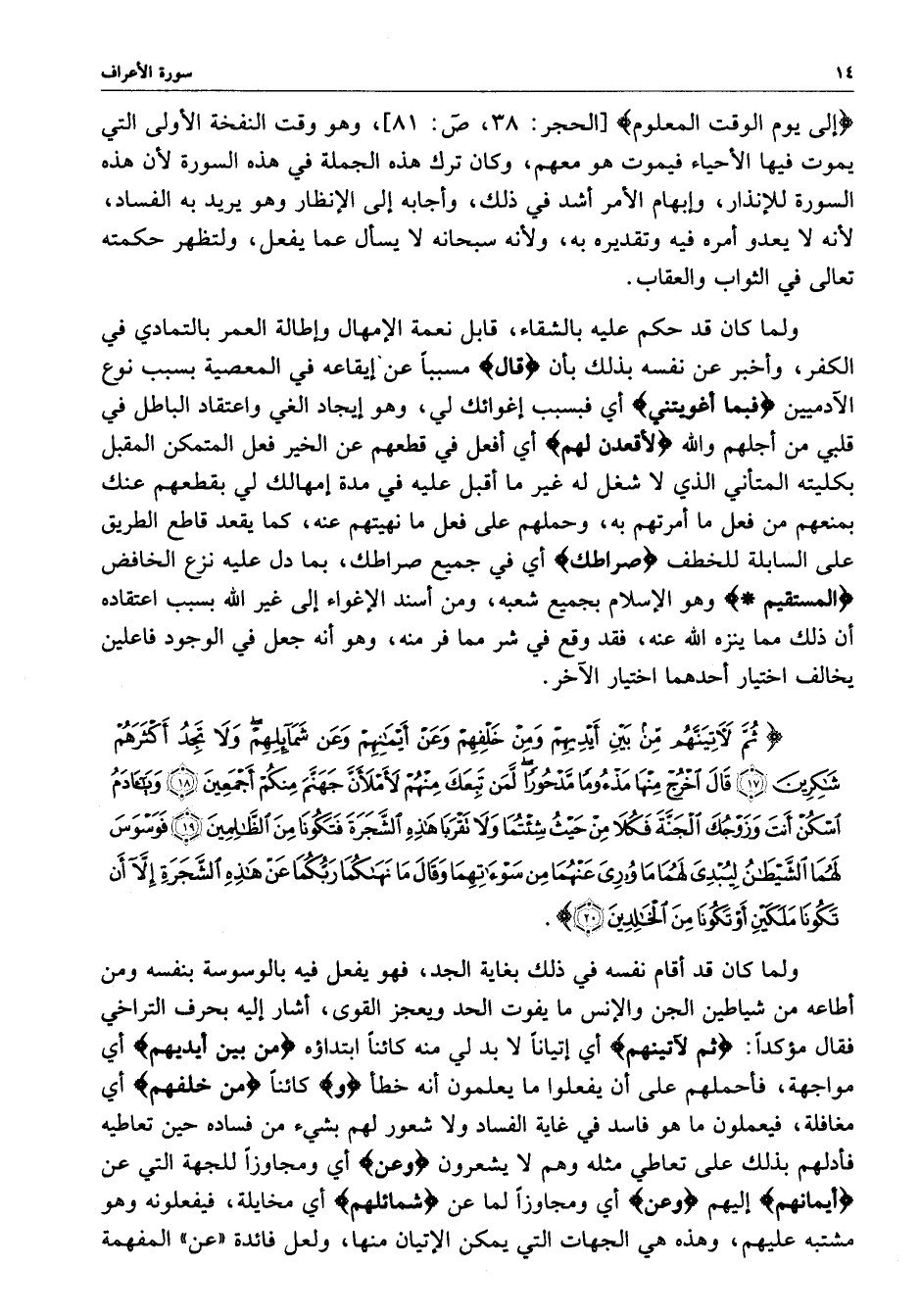 ) ثُمَّ لآتِيَنَّهُمْ مِّن بَيْنِ أَيْدِيهِمْ وَمِنْ خَلْفِهِمْ وَعَنْ أَيْمَانِهِمْ وَعَن شَمَآئِلِهِمْ وَلاَ تَجِدُ أَكْثَرَهُمْ شَاكِرِينَ قَالَ اخْرُجْ مِنْهَا مَذْءُوماً مَّدْحُوراً لَّمَن تَبِعَكَ مِنْهُمْ لأَمْلأَنَّ جَهَنَّمَ مِنكُمْ أَجْمَعِينَ وَيَاآدَمُ اسْكُنْ أَنتَ وَزَوْجُكَ الْجَنَّةَ فَكُلاَ مِنْ حَيْثُ شِئْتُمَا وَلاَ تَقْرَبَا هَذِهِ الشَّجَرَةَ فَتَكُونَا مِنَ الظَّالِمِينَ فَوَسْوَسَ لَهُمَا الشَّيْطَانُ لِيُبْدِيَ لَهُمَا مَا وُورِيَ عَنْهُمَا مِن سَوْءَاتِهِمَا وَقَالَ مَا نَهَاكُمَا رَبُّكُمَا عَنْ هَذِهِ الشَّجَرَةِ إِلاَّ أَن تَكُونَا مَلَكَيْنِ أَوْ تَكُونَا مِنَ الْخَالِدِينَ ( ( )