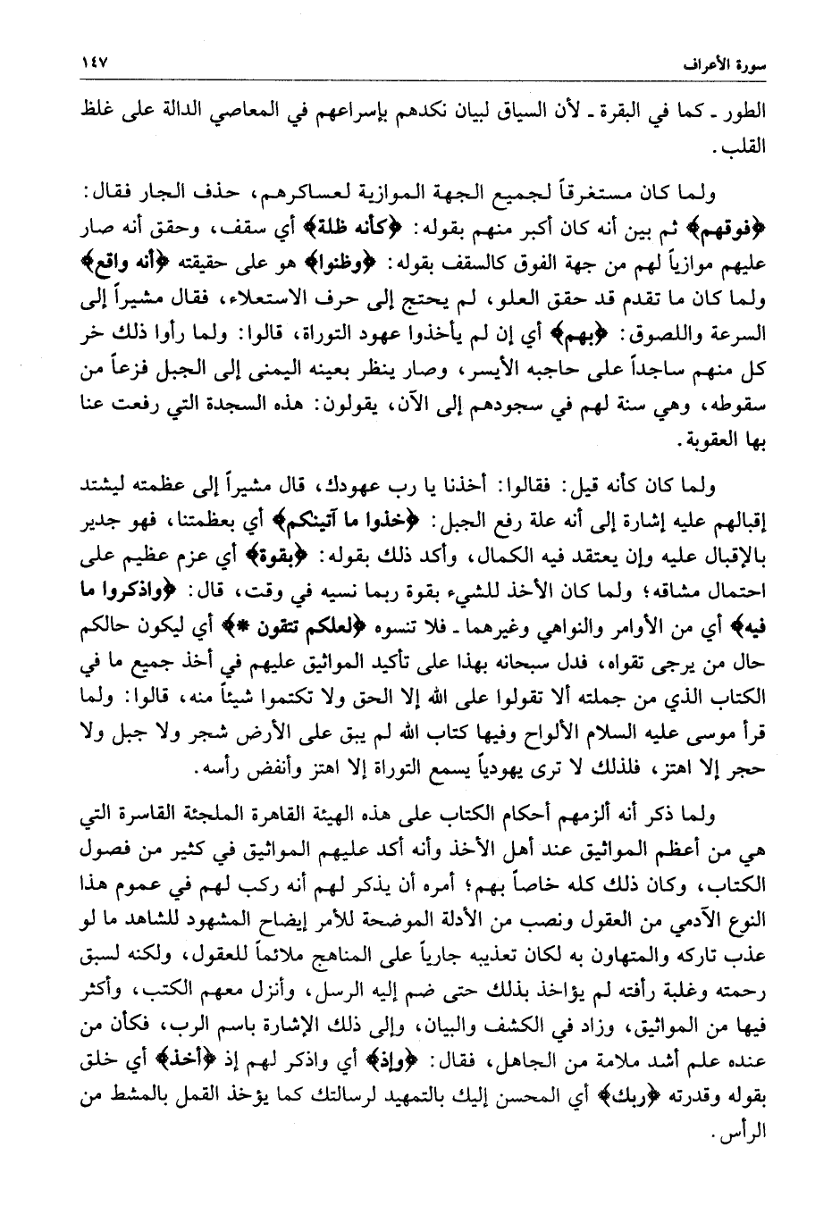 الطور - كما في البقرة - لأن السياق لبيان نكدهم بإسراعهم في المعاصي الدالة على غلط القلب ولما كان مستغفراً لجميع الجهة الموزية لعساكرهم ، حذف الجار فقال : ( فوقهم ( ثم بين أنه كان أكبر منهم بقوله : ( كأنه ظلة ) أي سقف ، وحقق أنه صار عليهم موازياً لهم من جهة الفوق كالسقف بقوله : ( وظنوا ( هو على حقيقة ) أنه واقع ( ولما كان ما تقدم قد حقق العلو ، لم يحتج إلى حرف الاستعلاء ، فقال مشيراً إلى السرعة واللصوف : ( بهم ) أي إن لم يأخذوا عهود التوارة ، قالوا : ولما رأوا ذلك خر كل منهم ساجداً على حاجبه الأيسر ، وصار ينظر بعينه اليمنى إلى الجبل فزعاً من سقوطه ، وهي سنة في سجودهم إلى الآن ، يقولون : هذه السجدة التي رفعت عنا بها العقوبة ولما كان كأنه قيل : فقالوا : أخذنا يارب عهودك ، قال مشيراً إلى عظمته ليشتد إقبالهم عليه إشارة إلى أنه علة رفع الجبل : ( خذوا ما آتيناكم ) أي بعظمتنا ، فهو جدير بالإقبال عليه وإن يعتقد فيه الكمال ، وأكد ذلك بقوله : ( بقوة ) أي عزم عظيم على احتمال مشاقة ؛ ولما كان الأخذ للشيء بقوة ربما نسبة في وقت ، قال : ( واذكروا فيه ) أي من الأوامر والنواهي وغيرهما - فلا تنسوه ) بقوة ) أي عزم عظيم على احتمال مشاقة ؛ ولما كان الأخذ للشيء بقوة ربما نسبة في وقت ، قال : ( واذكروا فيه ( اي من الأوامر والنواهي وغيرها - فلا تنسوه ) لعلكم تتقون ) أي ليكون حالكم حال من يرجى تقواه ، فدل سبحانه بهذا على تأكيد المواثيق عليهم في أخذ جميع مافي الكتاب الذي من جملته ألا تقولوا على الله إلا الحق ولا تكتموا شيئاً منه ، قالوا : ولما قرأة موسى عليه السلام الأولواح وفيها كتاب الله لم يبق على الأرض شجر ولا جبل ولا حجر إلا اهتز ، فلذلك لا ترى يهودياً يسمع التوارة إلا اهتز وأنقض راسه ولما ذكر أنه ألزمهم أحكام الكتاب على هذه الهيئة القاهرة الملجئة القاسرة التي هي من أعظم المواثيق عند أهل الأخذ وأنه أكد عليهم المواثيق في كثير من فصول الكتاب ، وكان ذلك كله خاصاً بهم ؛ أمره أن يذكر لهم أنه ركب لهم في عموم هذا النوع الآدمي من العقول ونصب من الأدلة الوضحة للأمر إيضاح المشهود للشاهد ما لو عذب تاركه والمتهاون به لكان تعذيبه جارياً على المناهج ملائماً للعقول ، ولكنه لسبق رحمته وغلبة رأفته لم يؤاخذ بذلك حتى ضم إليه الرسل ، وأنزل معهم الكتب وأكثر فيها من المواثيق ، وزاد في الكشف والبيان ، وإلى ذلك الإشارة باسم الرب ، فكأن من عنده علم أشد ملامة من الجاهل ، فقال : ( وإذ ) أي واذكر لهم إذ ) أخذ ) أي خلق بقوله وقدرته ) ربك ) أي المحسن إليك بالتمهيد لرسالتك كما يؤخذ القمل بالمشط من الرأي