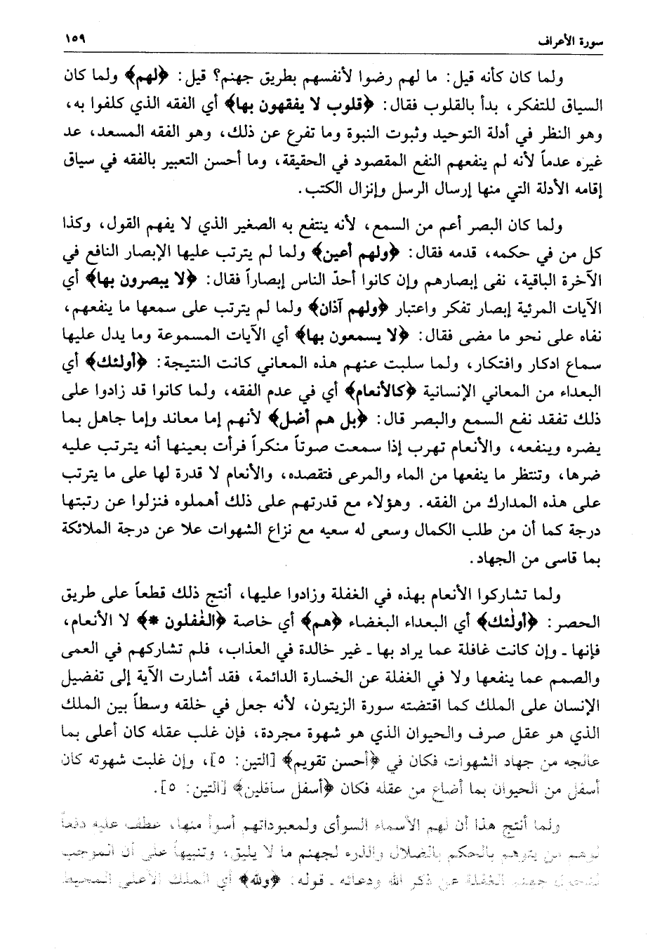 ولما كان كأنه قيل : ما لهم رضوا لأنفسهم بطريق جهنم ؟ قيل : ( لهم ( ولما كان السياق للتفكير ، بدأ بالقلوب فقال : ( قلوب لا يفقهون بها ) أي الفقه الذي كلفوا به ، وهو النظر في أدلة التوحيد وثبوت النبوة وما تفرغ عن ذلك ، وههو الفقه المسعد ، عد غيره عد غيره عدماً لأنه لم ينفعهم النفع المقصود في الحقيقة ، وما أحسن التعبير بالفقه في السياق إقامه الأدلة التي منها إرسال الرسل وإنزال الكتب ولما كان البصر أعم من السمع ، لأنه ينتفع به الصغير الذي لا يفهم القول ، وكذا كل من في حكمه ، قدمه فقال : ( ولهم أعين ( ولما لم يترتب عليهما الإبصار النافع في الآخرة الباقية ، نفى إبصارهم وإن كانوا أحدّ الناس إبصاراً فقال : ( لا يبصرون بها ) أي الآيات المرئية إبصار تفكر واعتبار ) ولهم آذان ( ولما لم يتؤتب على سمعها ما ينفعهم ، نفاه على نحو ما مضى فقال : ( لا يسمعون بها ) أي الآيات المسموعة وما يدل عليها سماع ادكار وافتكار ، ولما سلبت عنهم هذه المعاني كانت النتيجة : ( أولئك ) أي البعداء من المعاني الإنسانية ) كالأنعام ) أي في عدم الفقه ، ولما كانوا قد زادوا على ذلك تفقد نفع السمع والبصر قال : ( بل هم أضل ( لأنهم إما معاند وإما جاهل بما يضره وينفعه ، والأنعام تهرب إذا سمعت صوتاً منكراً فرأت بعينها أنه يترتب عليه ضرها ، وتنتظر ما ينفعها من الماء والمرعى فتقصده ، والأنعام لا قدرة لها على ما يترتب على هذه المدارك من الفقه .