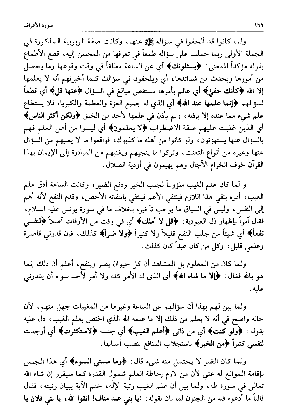 ولما كانوا قد ألحفوا في سؤاله ( صلى الله عليه وسلم ) عنها ، وكانت صفة الربوبية المذكورة في الجملة الأولى ربما حملت على سؤاله طمعاً في تعريفها من المحسن إليه ، قطع الأطماع بقوله مؤكداً للمعنى : ( يسئلونك ) أي عن الساعة مطلقاً في وقت وقوعها وما يحصل من أمورها ويحدث من شدائدها ، أي ويلحفون في سؤالك كلما أخبرتهم أنه لا يعلمها إلا الله ) كأنك حفيٌّ ) أي عالم بأمرها مستقص مبالغ في السؤال ) عنها قل ) أي قطعاً لسؤالهم ) إنما علمها عند الله ) أي الذي له جميع العزة والعظمة والكبرياء فلا يستطاع علم شيء مما عنده إلا بإذنه ، ولم يأذن في علمها لأحد من الخلق ) ولكن أكثر الناس ) أي الذين غلبت عليهمصفة الاضطراب ) لايعلمون ) أي ليسوا من أهل العلم فهم بالسؤال عنها يستهزئون ، ولو كانوا من أهله ما كذبوك ، فوقعوا ما لا يعنيهم من السؤال عنها وغيره من أنواع التعنت ، وتركوا ما ينجيهم ويغنيهم من المبادرة إلى الإيمان بهذا القرآن خوف انخرام الآجال وهم يهيمون في أدوية الضلال ولما كان علم الغيب ملزوماً لجلب الخير ودفع الضير ، وكانت الساعة أدق علم الغيب ، أمره بنفي هذا اللازم فينتفي الأعم بانتفائه الأخص ، وقدم النفع لأنه أهم إلى النفس ، وليس في السياق ما يوجب تأخيره بخلاف ما في سورة يونس عليه السلام ، فقال آمراً بإظهار ذل العبودية : ( قل لا أملك ) أي في وقت من الأوقات أصلاً ) لنفسي نفعاً ( اي شيئاً من جلب النفع قليلاً ولا كثيراً ) ولا ضراً ( كذلك ، فإن قدرتي قاصرة وعلمي قليل ، وكل منة كان عبداً كان كذلك ولما كان من المعلوم بل المشاهدة أن كل حيوان يضر وينفع ، أعلم أن ذلك إنما هو بالله فقال : ( إلا ما شاء الله ) أي الذي له الأمر كله ولا أمر لأحد سواه أن يقدرني عليه ولما بين لهم بهذا أن سؤالهم عن الساعة وغيرها من المغيبات جهل منهم ، لأن حالة واضح في أنه لا يعلم من ذلك إلا ما علمه الله الذي اختص بعلم الغيب ، دل عليه بقوله : ( ولوكنت ) أي من ذاتي ) أعلم الغيب ( اي جنسه ) لا ستكثرت ) أي أوجدت لنفسي كثيراً ) من الخير ( باستجلاب المنافع بنصب أسبابها ولما كان الضر لا يحتمل منه شيء قال : ( وما مسني السوء ) أي هذه الجنس بإقامة الموانع له عني لأن لازم إحاطة العلم شمول القدرة كما سيقرر إن شاء الله تعالى في سورة طه ، ولما بين أن علم الغيب رتبة الإله ، ختم الآيه ببيان رتبته ، فقال قالباً ما أدعوه فيه من الجنون لما بان بقوله : ( يا بني عبد مناف اتقوا الله ، يا بني فلان يا