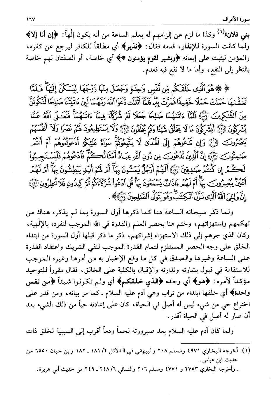 ) هُوَ الَّذِي خَلَقَكُمْ مِّن نَّفْسٍ وَاحِدَةٍ وَجَعَلَ مِنْهَا زَوْجَهَا لِيَسْكُنَ إِلَيْهَا فَلَماَّ تَغَشَّاهَا حَمَلَتْ حَمْلاً خَفِيفاً فَمَرَّتْ بِهِ فَلَمَّآ أَثْقَلَتْ دَّعَوَا اللَّهَ رَبَّهُمَا لَئِنْ آتَيْتَنَا صَالِحاً لَّنَكُونَنَّ مِنَ الشَّاكِرِينَ فَلَمَّآ آتَاهُمَا صَالِحاً جَعَلاَ لَهُ شُرَكَآءَ فِيمَآ آتَاهُمَا فَتَعَالَى اللَّهُ عَمَّا يُشْرِكُونَ أَيُشْرِكُونَ مَا لاَ يَخْلُقُ شَيْئاً وَهُمْ يُخْلَقُونَ وَلاَ يَسْتَطِيعُونَ لَهُمْ نَصْراً وَلاَ أَنْفُسَهُمْ يَنصُرُونَ وَإِن تَدْعُوهُمْ إِلَى الْهُدَى لاَ يَتَّبِعُوكُمْ سَوَآءٌ عَلَيْكُمْ أَدَعَوْتُمُوهُمْ أَمْ أَنْتُمْ صَامِتُونَ إِنَّ الَّذِينَ تَدْعُونَ مِن دُونِ اللَّهِ عِبَادٌ أَمْثَالُكُمْ فَادْعُوهُمْ فَلْيَسْتَجِيبُواْ لَكُمْ إِن كُنتُمْ صَادِقِينَ أَلَهُمْ أَرْجُلٌ يَمْشُونَ بِهَآ أَمْ لَهُمْ أَيْدٍ يَبْطِشُونَ بِهَآ أَمْ لَهُمْ أَعْيُنٌ يُبْصِرُونَ بِهَآ أَمْ لَهُمْ آذَانٌ يَسْمَعُونَ بِهَا قُلِ ادْعُواْ شُرَكَآءَكُمْ ثُمَّ كِيدُونِ فَلاَ تُنظِرُونِ إِنَّ وَلِيِّيَ اللَّهُ الَّذِي نَزَّلَ الْكِتَابَ وَهُوَ يَتَوَلَّى الصَّالِحِينَ ( ( )