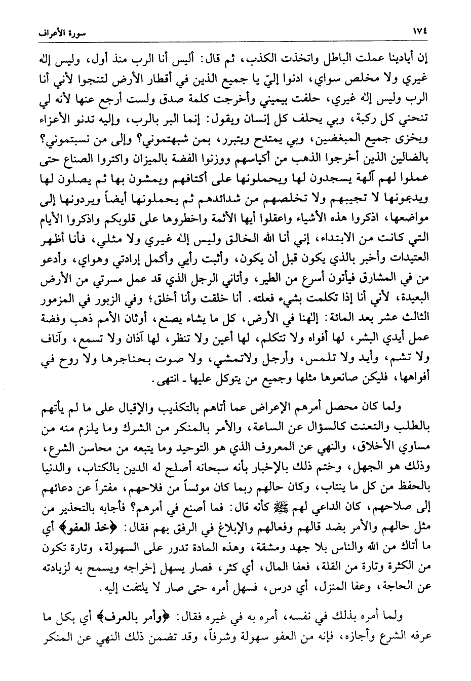 أنا خلقت وأنا أخلق ؛ وفي الزبور في المزمور الثالث عشر بعد المائه : إلهنا في الأرض ، كل ما يشاء يصنع ، أوثان الأمم ذهب وفضة عمل أيدي البشر ، لها أفواه ولا تتكلم ، لها أعين ولا تنظر ، لها آذان ولا تسمع ، وآناف ولا تشم ، وأيد ولا تلمس ، وأرجل ولا تمشي ، ولا صوت بحناجرها ولا روح في أفواهها ، فليكن صانعوها مثلها وجميع من يتوكل عليها - انتهى ولما كان محصل أمرهم الإعراض عما أتاهم بالتكذيب والإقبال على ما لم يأتهم بالطلب والتعنت كالسؤال عن الساعة ، والأمر بالمنكر من الشرك وما يلزم منه من مساوي الأخلاق ، والنهي عن المعروف الذي هو التوحيد وما يتبعه من محاسن الشرع ، وذلك هو الجهل ، وختم ذلك بالإخبار بأنه سبحانه أصلح له الدين بالكتاب ، والدنيا بالحفظ من كل ما ينتاب ، وكان حالهم ربما كان موئسا من فلاحهم ، مفتراً عن دعائهم إلى صلاحهم ، كان الداعي لهم ( صلى الله عليه وسلم ) كأنه قال : فما أصبع في أمرهم ؟ فأجابه بالتحذير من مثل حالهم والأمر بضد قالهم وفعالهم والإبلاغ في الرفق بهم فقال : ( خذ العفو ) أي ما أتاك من الله والناس بلا جهد ومشقه ، وهذا المادة تدور على السهولة ، تارة تكون من الكثرة وتارة من القلة ، فعفا المال ، أي كثر ، فصار يسهل إخراجه ويسمح به لزيادته عن الحاجة ، وعفا المنزل ، أي درس ، فسهل أمره حتى صار لا يلتفت إليه .