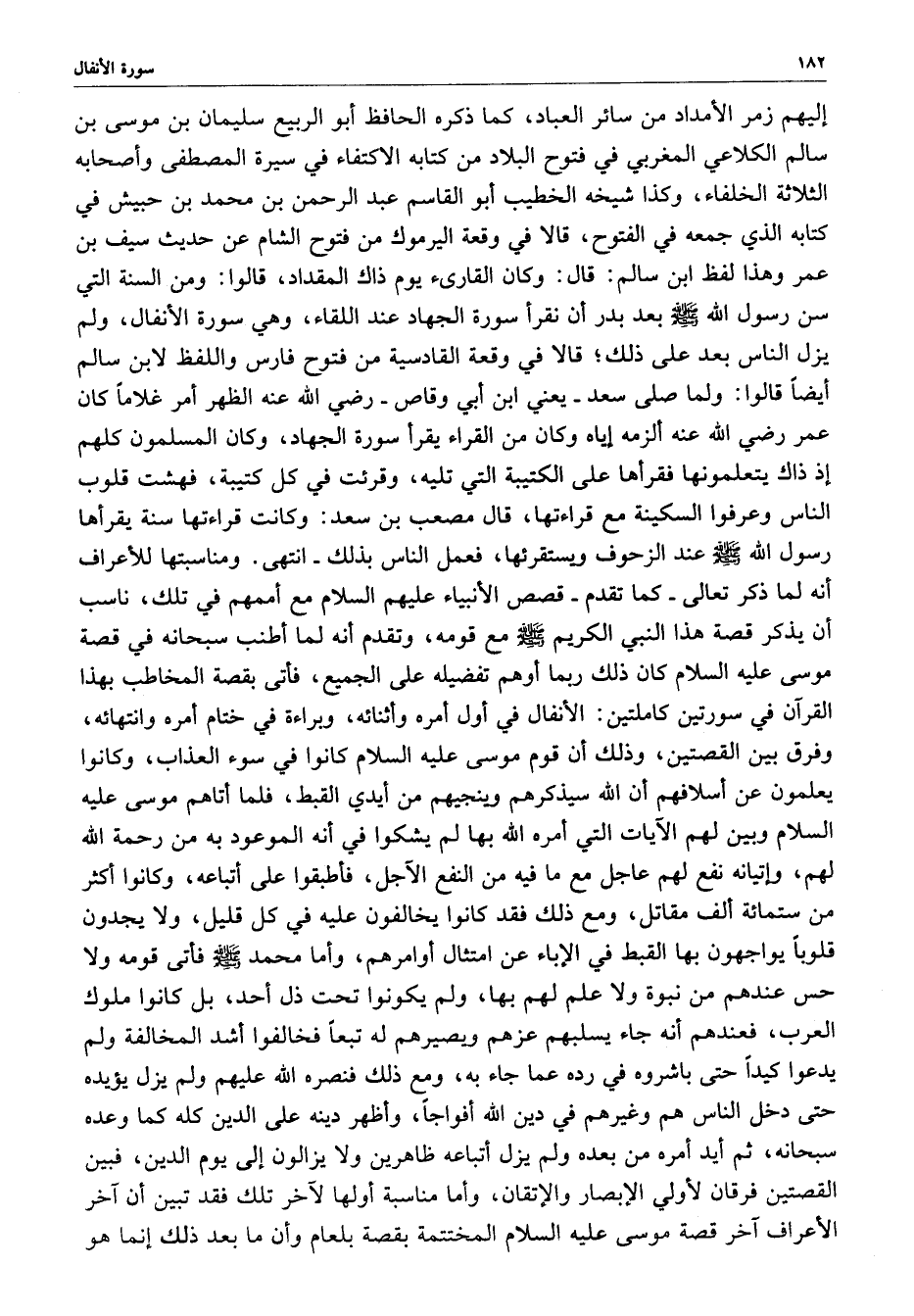 إليهم زمر الأمداد من سائر العباد ، كما ذكره الحافظ أبو الربيع سليمان بن موسى بن سالم الكلاعي المغربي في فتوح البلاد من كتابه الاكتفاء في سيرة المصطفى وأصحابه الثلاثة الخلفاء ، وكذا شيخةالخطيب أبو القاسم عبد الرحمن بن محمد بن حبيش في كتابه الذي جمعه في الفتوح ، قالا وقعه اليرموك من فتوح الشام عن حديث سيف بن عمر وهذا لفظ ابن سالم : قال : وكان القارئ يوم ذاك المقداد ، قالوا : ومن السنة التي سن رسول الله ( صلى الله عليه وسلم ) بعد بدر أن نقرأ سورة الجهاد عند اللقاء ، وهي سورة الأنفال ، ولم يزل الناس بعد على ذلك ؛ قالا في وقعه القادسية من فتوح فارس واللفظ لابن سالم أيضاً قالوا : ولما صلى سعد - يعني ابن أبي وقاص - رضي الله عنه الظهر أمر غلاماً كان عمر رضي الله عنه ألزمه إياه وكان من القراء يقرأ سورة الجهاد ، وكان المسلمون كلهم إذ ذاك يتعلمونها فقرأها على الكتبية التي تليه ، وقرئت في كل كتيبة ، فهشت قلوب الناس وعرفوا السكينة مع قراءتها ، قال مصعب بن سعيد : وكانت قراءتها سنة يقرأها رسول الله ( صلى الله عليه وسلم ) عند الزخرف ويستقرئها ، فعمل الناس بذلك - انتهى .