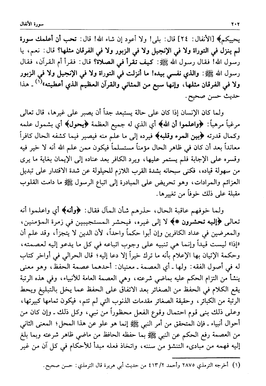 يحييكم ( ) [ الأنفال : 24 ] قال : بلى ولا أعود إن شاء الله قال : ( تجب أن أعلمك سورة لم ينزل في التوراة ولا في الإنجيل ولا في الزبور ولا في الفرقان مثلها ؟ ( قال : نعم ، يا رسول الله فقال رسول الله ( صلى الله عليه وسلم ) : ( كيف تقرأ في الصلاة ؟ ( قال : فقرأ أم القرآن ، فقال رسول الله ( صلى الله عليه وسلم ) : ( والذي نفسي بيده ما أنزلت في التوراة ولا في الإنجيل ولا في الزبور ولا في الفرقان مثلها ، وإنها سبع من المثاني والقرآن العظيم الذي أعطيته ( - هذا حديث حسن صحيح ولما كان الإنسان إذا كان على حالة يستعبد جداً أن يصبر على غيرها ، قال تعالى مرغباً مرهباً : ( واعلموا أن الله ) أي الذي له جميع العظمة ) يحول ) أي بشمول علمه وكمال قدرته ) بين المرء وقلبه ( فيرده إلى ما علم منه فيصير فيما كشفه الحال كافراً معانداً بعد أن كان في ظاهر الحال مؤمناً مستسلماً فيكون ممن علم الله أنه لا خير فيه وقسره على الإجابة فلم يستمر عليها ، ويرد الكافر بعد عناده إلى الإيمان بغاية ما يرى من سهولة قيادة ، فكنى سبحانه بشدة القرب اللازم للحيلولة عن شدة الاقتدار على تبديل العزائم والمرادات ، وهو تحريض على المبادرة إلى اتباع الرسول ( صلى الله عليه وسلم ) ما دامت القلوب مقلبة على ذلك خوفاً من تغييرها ولما خوفهم عاقبة الحال ، حذرهم شأن المآل فقال : ( وأنه ) أي واعلموا أنه تعالى ) إليه تحشرون ( لا إلى غيره ، فيحشر المستجيبين في زمرة المؤمنين ، والمعرضين في عداد الكافرين وإن أبوا حكماً واحداً ، لأن الدين لا يتجرأ ، وقدم علم أن ) إذا ( ليست قيداً وإنما هي تنبيه على وجوب اتباعه في كل ما يدعو إليه لعصمته ، وحكمه الإتيان بها الإعلام بأنه ما ترك خيراً إلا دعا إليه ؛ قال الحرالي في أواخر كتاب له في أصوال الفقه : ولها - أي العصمة - معنيان : أحدهما عصمة الحفظ ، وهومعنى ينشأ من التزام الحكم عليه بماضي شرعته ، وهي العصمة العامة للأنبياء ، وفي هذه الرتبة يقع الكلام في الحفظ من الصغائر بعد الاتفاق على الحفظ عما يخل بالتبليغ ويحط الرتبة والكبائر ، وحقيقة الصغائر مقدمات الذنوب التي لم تتم ، فيكون تمامها كبيرتها ، وعلى ذلك بنى قوم احتمال وقوع الفعل محظوراً من نبي ، وكل ذلك - وإن كان من أحوال انبياء - فإن المتحقق من أمر النبي ( صلى الله عليه وسلم ) إنما هو علو عن هذا المحل ؛ المعنى الثاني من العصمة رفع الحكم عن النبي ( صلى الله عليه وسلم ) بما حفظه الحافظ من ماضي ظاهر شرعته وبما بلغ إليه فهمه من مبادئ التنشؤ من سننه ، واتخاذ فعله مبدأ للأحكام في كل آن من غير