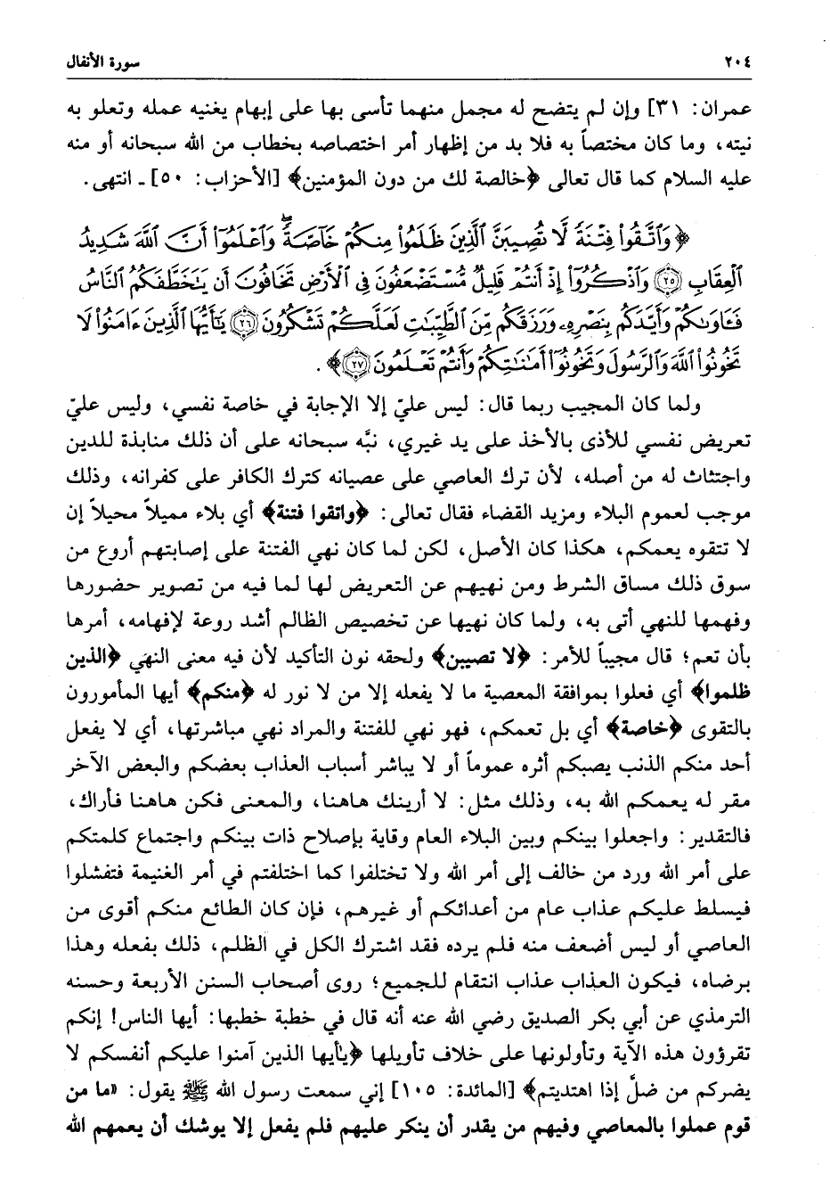 ولما كان لمجيب ربما قال : ليس عليّ إلا الإجابة في خاصة نفسي ، وليس عليّ تعلايض نفسي اللأذى بالأحد على يد غيري ، نَّبه سبحانه على أن ذلك منابذة للدين واجتثاث له من أصله ، لأن ترك العاصي على عصيانه كترك الكافر على كفرانه ، وذلك موجب لعموم البلاء ، ومزيد القضاء فقال تعالى : ( ةاتقوا فتنة ) أي بلاء مميلاً محيلاً إن لا تتقوه يعمكم ، هكذا كان الأصل ، لكن لما كاننهي الفتنة على إصابتهم أروع من سوق ذلك مساق الشرط ومن نهيهم عن التعريض لها لما فيه من تصوير حضورها وفهمها للنهي اتى به ، ولما كان نهيها عن تخصيص الظالم أشد روعة لإفهامه ، أمرها يأن تعم ؛ قال مجيباً للأمر : ( لا تصيبن ( ولحقه نون التأكيد لأن فيه معنى النهي ) الذين ظلموا ( اي فعلوا بموافقة المعصية ما لا يفعله إلا من لا نور له ) منكم ( أيها المأمورن بالتقوى ) خاصة ( اي بل تعمكم ، فهو نهي للفتنة والمراد نهي مباشرتها ، أي لا يفعل أحد منكم الذنب يصبكم أثره عموماً أو لا يباشر أسباب العذاب بعضكم والبعض الاخر مقر له يعمكم الله به ، وذلك مثل : لا أرينك هاهنا ، والمعنى فكن هاهنا فأراك فالتقدير : واجعلوا بينكم وبين البلاء العام وقاية بإصلاح ذات بينكم واجتماع كلنتكم على أمر الله ورد من خالف إلى أمر الله ولا تختلفواكما اختلفتم في أمر الغنيمة فتفشلوا فيسلط عليكم عذاب عام من أعدائكم أو غيرهم ، فإن كان الطائع منكم أقوى من العاصي أو ليس أضعف منه فلم يرده فقد اشترك الكل في الظلم ، ذلك بفعله وهذا برضاه ، فيكون العذاب عذاب انتقام للجميع ؛ روى أصحاب السنن الأربعة وحسنه الترميذي عن أبي الصديق رضي الله عنه أنه قال في خطبة خطبها : أيها الناس إنكم تقرؤن هذه الآية وتأولونها على خلاف تأويلها ) ) يأيها الذين آمنوا عليكم أنفسهم لا يضركم من ضلّ إذا اهتديتم ( ) [ المائدة : 105 ] إني سمعت رسول الله ( صلى الله عليه وسلم ) يقول : ( ما من قوم عملوا بالمعاصي وفيهم من يقدر أن ينكر عليهم فلم يفعل إلا يوشك أن يعمهم الله