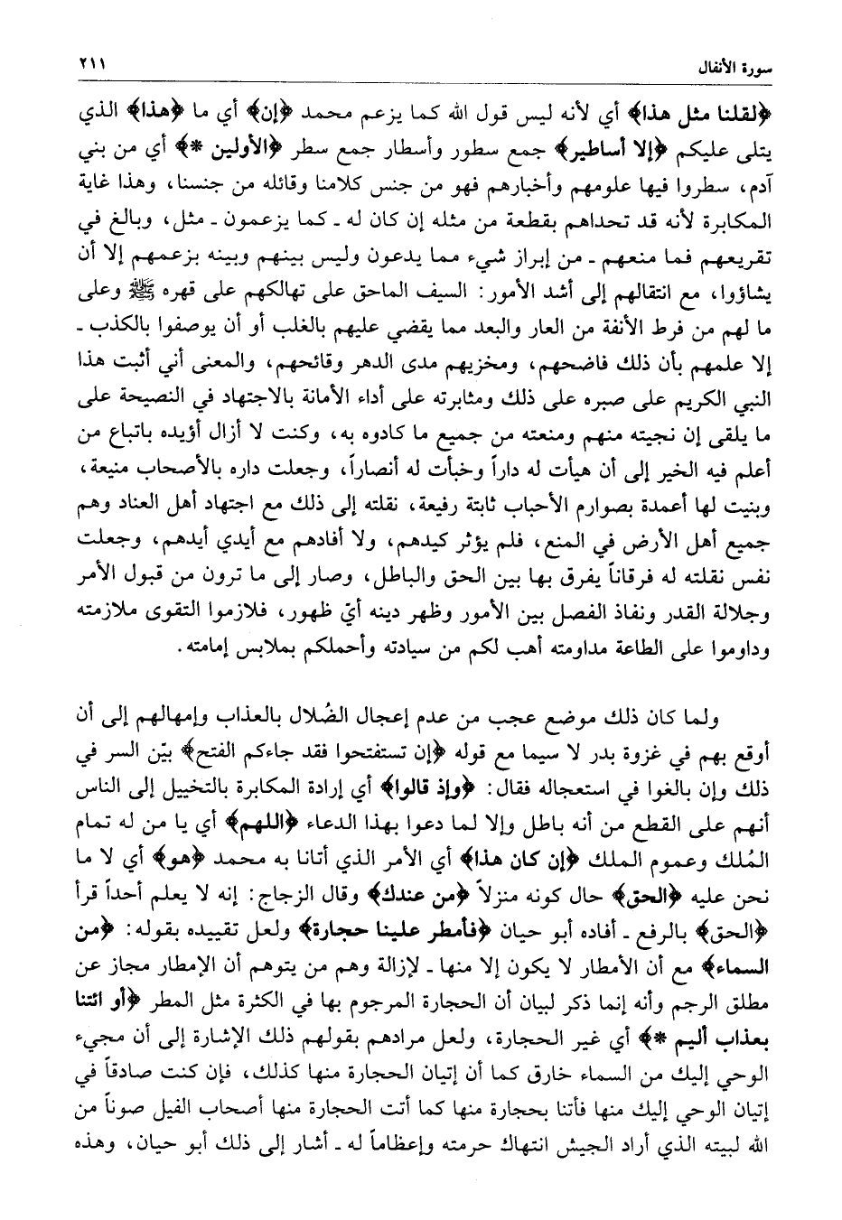 ولما كان ذلك موضع عجب من عدم إعجال الضلاُ بالعذاب وإمهالهم إلى أن أوقع بهم في غزوة بدر لا سيما مع قوله ) إن تستفتحوا فقد جاءكم الفتح ( بيّن السر في ذلك وإن بالغوا في استعجاله فقال : ( وإذ قالوا ) أي إرادة المكابر بالنخييل إلى الناس أنهم على القطع من أنه باطل وإلا لما دعوا بهذا الدعاء ) اللهم ) أي يا من له تمام المُلك وعموم الملك ) إن كان هذا ) أي الأمر الذي أتانا به محمد ) هو ) أي لا ما نحن عليه ) الحق ( حال كونه منزلاً ) من عندك ( وقال الزجاج : إنه لا يعلم أحداً قرأ ) الحق ( بالرفع - أفاده أبو حيان ) فأمطر علينا حجارة ( ولعل تقييده بقوله : ( من السماء ( مع أن الأمطار لايكون إلا منها - لإزالة وهم من يتوهم أن الإمطار مجاز عن مطلق الرجم وأنه إنما ذكر لبيان أن الحجارة المرجوم بها في الكثرة مثل المطر ) أو ائتنا بعذاب أليم ) أي غير الحجارة ، ولعل مرادهم بقولهم ذلك الإشارة إلى أن مجئ الوحي إليك منها فأتنا بحجارة منها كما أتت الحجارة منها أصحاب الفيل صوناً من الله لبيته الذي أراد الجيس انتهاك حرمته وإعظاماً له - أشار إلى ذلك أبو حيان ، وهذه