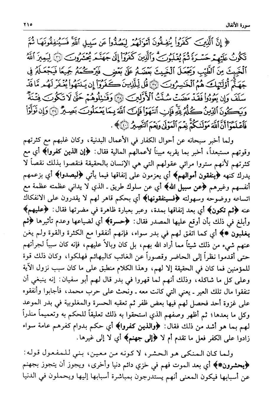 ) إِنَّ الَّذِينَ كَفَرُواْ يُنفِقُونَ أَمْوَالَهُمْ لِيَصُدُّواْ عَن سَبِيلِ اللَّهِ فَسَيُنفِقُونَهَا ثُمَّ تَكُونُ عَلَيْهِمْ حَسْرَةً ثُمَّ يُغْلَبُونَ وَالَّذِينَ كَفَرُواْ إِلَى جَهَنَّمَ يُحْشَرُونَ لِيَمِيزَ اللَّهُ الْخَبِيثَ مِنَ الطَّيِّبِ وَيَجْعَلَ الْخَبِيثَ بَعْضَهُ عَلَى بَعْضٍ فَيَرْكُمَهُ جَمِيعاً فَيَجْعَلَهُ فِي جَهَنَّمَ أُوْلَئِكَ هُمُ الْخَاسِرُونَ قُل لِلَّذِينَ كَفَرُواْ إِن يَنتَهُواْ يُغَفَرْ لَهُمْ مَّا قَدْ سَلَفَ وَإِنْ يَعُودُواْ فَقَدْ مَضَتْ سُنَّةُ الأَوَّلِينِ وَقَاتِلُوهُمْ حَتَّى لاَ تَكُونَ فِتْنَةٌ وَيَكُونَ الدِّينُ كُلُّهُ لله فَإِنِ انْتَهَوْاْ فَإِنَّ اللَّهَ بِمَا يَعْمَلُونَ بَصِيرٌ وَإِن تَوَلَّوْاْ فَاعْلَمُواْ أَنَّ اللَّهَ مَوْلاَكُمْ نِعْمَ الْمَوْلَى وَنِعْمَ النَّصِيرُ ( ( )