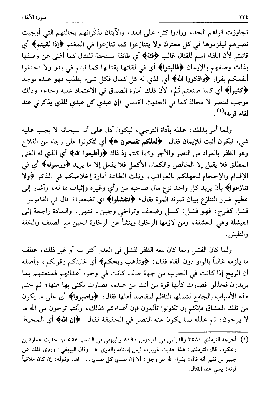 تجاوزت قواهم الحد ، وزادوا كثرة على العد ، والآتيان تذكّرهم بحالتهم التي أوجبت نصرهم ليلزموها في كل معترك ولا يتنازعوا كما تنازعوا في المغنم ) إذا لقيتم ) أي قاتلتم لأن اللقاء اسم للقتال غالب ) فئة ) أي طائفة مستحقة للقتال كما أغنى عن وصفها بذلك وصفهم بالإيمان ) فاثبتوا ) أي في لقائها بقتالها كما ثبتم في بدر ولا تحدثوا أنفسكم بفرار ) واذكروا الله ) أي في لقائها بقتالها كما ثبتم في بدر ولا تحدثوا ) كثيراً ) أي كما صنعتم ثَمَّ ، لأن ذلك أمارة الصدق في الاعتماد عليه وحده ، وذلك موجب للنصر لا محالة كما في الحديث القدسي ( إن عبدي كل عبدي للذي يذكرني عند لقاء قرنه ) ولما أمر بذلك ، علله بأداة الترجي ، ليكون أدل على أنه سبحانه لا يجب عليه شيء فيكون للإيمان فقال : ( لعلكم تفلحون ) أي لتكونوا على رجاء من الفلاح وهو الظفر بالمراد من النصر والأجر وكما كنتم إذ ذاك ) وأطيعوا الله ) أي الذي له الغنى المطلق فلا يقبل إلا الخالص والكمال الأكمل فلا يفعل إلا ما يريد ) ورسوله ) أي في الإقدام والإقدام والإحجام لجهلكمبالعواقب ، وتلك الطاعة امارة إخلاصكم في الذكر ) ولا تنازعوا ( بأن يريد كل واحد نزع مال صاحبه من رأى وغيره وإثبات ما له ، وأشار إلى عظيم ضرر التنازع ببيان ثمرته المرة فقال ؛ ) فتفشلوا ) أي تضعفوا ؛ قال في القاموس : فشل كفرح ، فهو فشل ، كسل وضعف وتراخي زجبن - انتهى .