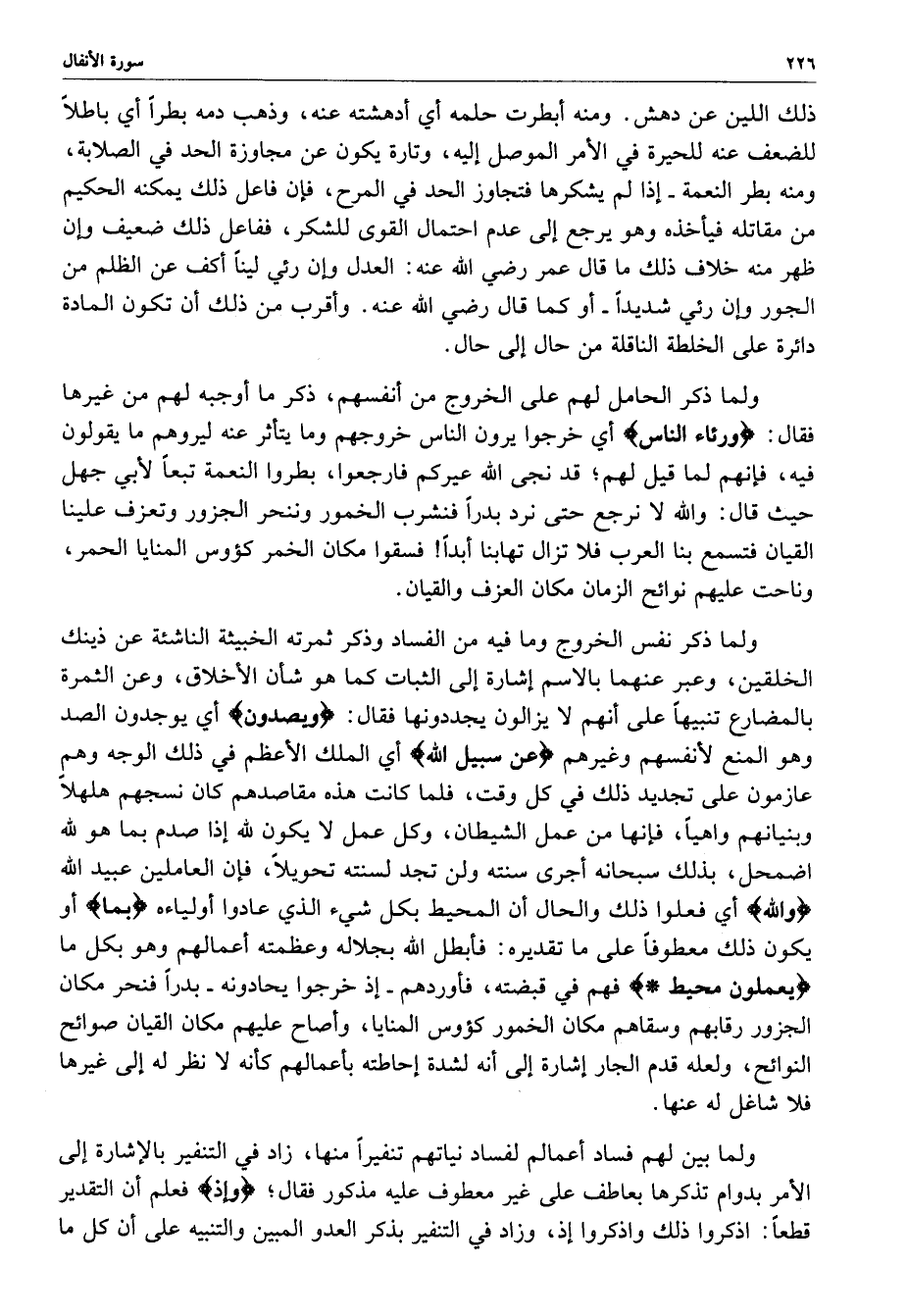 وأقرب من ذلك أن تكون المادة دائرة على الخلطة الناقلة من حال إلى حال ولما ذكر الحامل لهم على الخروج من أنفسهم ، ذكر ما أوجبه لهم من غيرها فقال : ( ورئاء الناس ) أي خرجوا يرون الناس خروجهم وما يتأثر عنه ليروهم ما يقولون فيه ، فإنهم لما قيل لهم ؛ قد نجى الله عيركم فارجعوا ، بطروا النعمة تبعاً لأبي جهل حيث قال : والله لا نرجع حتى نرد بدراً فنشرب الخمور وننحر الجزور وتعزف علينا القيان فتسمع بنا العرب فلا تزال أبداً فسقوا مكان الخمر كؤوس المنايا الحمر ، وناحت عليهم نوائح الزمان مكان العزف والقيان ، ولما ذكر نفس الخروج وما فيه من الفساد وذكر ثمرته الخبيثة الناشئة عن ذينك الخلقين ، وعبر عنهما بالاسم إشارة إلى الثبات كما هو شأن الأخلاق ، وعن الثمرة بالمضارع تنبيهاً على أنهم لا يزالون يجدودنها فقال : ( ويصدون ) أي يوجدون الصد وهو المنع لأنفسهم وغيرهم ) عن سبيل الله ( اي الملك الأعظم في ذلك الوجه وهم عازمون على تجديد ذلك في كل وقت ، فلما كانت هذه مقاصدهم كان نسجهم هلهلاً وبنيانهم واهياً ، فإنها من عمل الشيطان ، وكل عمل لا يكون لله إذا صدم بما هو لله اضمحل ، بذلك سبحانه أجرى سنته ولن تجد لسنته تحويلاً ، فإن العالمين عبيد الله ) والله ) أي فعلوا ذلك والحال أن المحيط بكل شيء الذي عادوا أولياءه ) بما ( أو يكون ذلك معطوفاً على تقديره : فأبطل الله بجلاله وعظمته أعمالهم وهو بكل ما ) يعملون محيط ( فهم في قبضته ، فأرادهم - إذ خرجوا يحادونه - بدراً فنحر مكان الجزور رقابهم وسقاهم مكان الخمور كؤوس المنايا ، وأصاح عليهم مكان القيان صوائح النوائح ، ولعله قدم الجار إشارة إلى أنه لشدرة إحاطته بأعمالهم كأنه لا نظر له إلى غيرها فلا شاغل له عنها ، ولما كان بين لهم فساد أعمالهم لفساد نياتهم تنفيؤراً منها ، زاد في التنفير بالإشارة إلى الأمر بدوام تذكرها بعاطف على غير معطوف عليه مذكور فقال ؛ ) وإذ ( فعلم أن التقدير قطعاً : اذكروا ذلك واذكروا إذ ، وزاد في التنفير بذكر العدو المبين والتنبيه على أن كل ما