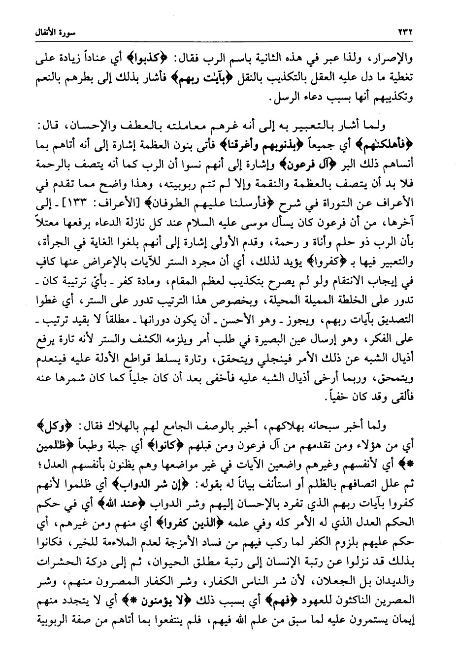 [ الأعراف : 133 ] - إلى آخرها ، من أن فرعون كان يسال موسى عليه السلام عند كل نازلة الدعاء برفعها معتلاً بأن الرب ذو حلم وأناة ورحمة ، وقدم الأولى إشارة إلى أنهم بلغوا الغاية في الجرأة ، والتعبير فيها ، ب ) كفروا ( يؤيد لذلك ، اي أن مجرد الستر للآيات بالإعراض عنها كافٍ في إيجاب الانتقام ولو لم يصرح بتكذيب لعظم المقام ، ومادة كفر - بأيّ ترتيبة كان - تدور على الخلطة المميلة المحلية ، وبخصوص هذا الترتيب تدور على الستر ، أي غطوا التصديق بآيات بآيات ربهم ، ويجوز - وهوالأحسن - أن يكون دورانها - مطلقاً لا بقيد ترتيب - على الفكر ، وهو إرسال عين البصيرة في طلب أمر ويلزمه الكشف والستر لأنه تارة يرفع اذيال الشبه عن ذلك الأمر فينجلي ويتحقق ، وتارة يسلط قواطع الأدلة عليه فينعدم ويمتحق ، وربما أرخى أذيال الشبه عليه فأخفى بعد أن كان جلياً كما كان شمرها عنه فألقى وقد كان خفياً .
