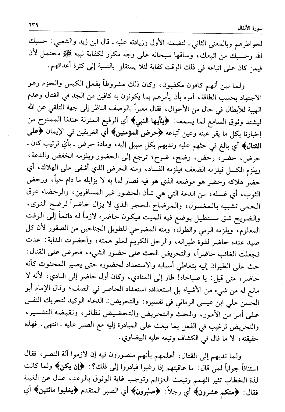 ولما بين أنهم كافون مكفيون ، وكان ذلك مشروطاً الكيس والحزم وهو الهيبة للأبطال في حال من الأحوال ، فقال معبراً بالوصف الناظر إلى جهة التلقي عن الله ليشتد وثوق السامع لما يسمعه : ( يأيها النبي ) أي الغريقين في الإيمان ) على القتال ) أي بالغ في حثهم عليه وندبهم بكل سبيل إليه ، ومادة حرض - بأيّ ترتيب كان - حرض ، حضر ، رحض ، رضح ، ضرح ؛ ترجع إلى الحضور ويلزمه الخفض والدعة ، ويلزم الكسل فيلزمه الضعف فيلزمه الفساد ، ومنه الحرض الذي اشفى على الهلاك ، اي حضر هلاكه وحضر هو موضعه الذي هو فيه فصار لما به لا يزايله ما دام حياً ، ورخص الثوب ، اي غسله ، من الدعه التي هي شأن الحضور غير المسافرين ، والرحضاء عرق الحمى تشبيه بالمغسول ، والمرضاح الحجر الذي لا يزال حاضراً لرضح النوى ، والضريح شق مستطيل يوضع فيه الميت فيكون حاضره لازماً له دائماً إلى الوقت المفلوم ، ويلزمه الرمي والطول ، ومنه المضرحي للطويل الجناحين من الصقور لأن كل صيد عنده حاضر لقوة طيرانه ، والرجل الكريم لعلو همته ، وأحضرت الدابة : عدت فجعلت الغائب حاضراً ، والتحريض الحث على حضور الشيء ، فحضر على القتال : حث على الطيران إليه بتعاطي أسبابه والاستعداد لحضوره حتى يصير المحثوث كانه حاضر ، متى قيل : يا صباحاه طار إلى المنادي ، وكان اول حاضر إلى النادي ، لأنه لا مانع له من شيء من الأشياء بل استعداده استعداد الحاضر في الصف ؛ وقال الإمام أبو الحسن علي ابن عيسى الرماني في تفسيره : والتحريض : الدعاء الوكيد لتحريك النفس على امر من الأمور ، والحث والتحريض والتحضيض نظائر ، ونقيضه التفسير ، والتحريض ترغيب في الفعل بما يبعث على المبادرة إليه مع الصبر عليه - انتهى .