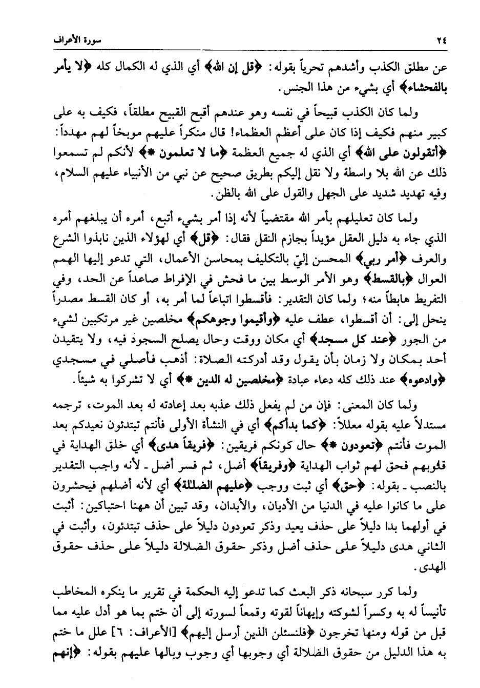 عن مطلق الكذب واشدهم تحرياً بقوله : ( قل إن الله ) أي الذي له الكمال كله ) لا يأمر بالفحشاء ) أي بشيء من هذا الجنس ولما كان الكذب قبيحاً في نفسه وهو عندهم أقبح القبيح مطلقاً فكيف به غلى كبير منهم فكيف إذا كان على اعظم العظماء قال منكراً عليهم موبخاً لهم مهدداً ) اتقولون على الله ) أي الذي له جميع العظمة ) ما لا يعلمون ( لأنكم لم تستمتعوا ذلك عنالله بلا واسطة ولا نقل إليكم بطريق صحيح عن نبي من النبياء عليهم السلام وفيه تهديد شديد على الجهل والقول على الله بالظنزلما كان تعليلهم بأمر الله مقتضياًُ لأنه إذا أمر بشيء اتبع أمره أن يبلغهم أمره الذي جاء به دليل العقل مؤيداً بجازم النقل فقال : ( قل ) أي لهؤلاء الذين نابذوا الشرع والعرف ) بالقسط ( وهو الأمر المحسن إليّ بالتكليف بمحاسن الأعمال التي تدعو إليها الهمم التفريط هابطاً منه ؛ ولما كان التقدير فاقسطوا اتباعاً لما أمر به ، أو كان القسط مصدراً ينحل إلى : أن أقسطوا عطف عليه ) وأقيموا وجوهكم ( مخلصين غير مرتكبين لشيء من الجور ) عند كل مسجد ) أي مكان ووقت وحال يصلح السجود فيه ، ولا يتقيدزن أحد بمكان ولا زمان بأن يقول وقد أدركته الصلاة أذهب فاصلى في مسجدي ) وادعوه ( عند ذلك كله دعاء عبادة ) مخلصين له الدين ) أي لا تشركوا به شيءاً ولما كان المعنى : فإن من لم يفعل ذلك بعد إعادته له بعد الموت ترجمه مستدلاً عليه بقوله معللاً : ( كما بداكم ) أي في النشأة الأولى فأنتم تبتدئون نعيدكم بعد الموت فأنتم ) تعودون ( حال كونكم فريقين : ( فريقاً هدى ) أي خلق الهدايةفي قلوبهم فحق لهم ثواب الهداية ) وفريقاً ( أضل ، ثم فسر أضل - لأنه واجب الهداية في بالنصب - بقوله : ( حق ( اي ثبت ووجب ) عليهم الضلالة ) أي لأنه أضلهم فيحشرون على ما كانو عليه في الدنيا من الأديان ، والبدان ، وقد تبين أن ههنا احتباكين : أثبت في اولهما بدا دليلاً على حذف يعيد وذكر تعودون دليلاً على حذف تبتدئون ، وأثبت في الثاني هدى دليلاً على حذف أضل وذكر حقوق الضلالة دليلاً على حذف حقوق الهدى. ، ولما كرر سبحانه ذكر البعث كما تدعو إليه الحكمة في تقرير ما ينكره المخاطب تأنيساً له به وكسراً لشوكته وإيهاناً لقوته وقمعاً لسورته إلى أن ختم بما هو أدل عليه مما قبل من قوله ومنها تخرجون