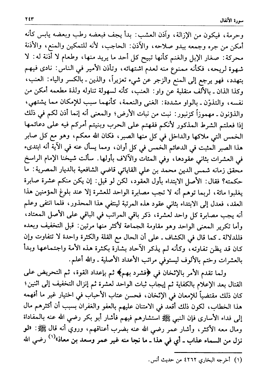 وحرمة ، فيكون من الإزالة ، وآذن العشب : بدأ يجف فبعضه رطب وبعضه يابس كأنه أمكن من جره وجمعه ببدو صلاحه ، والآذن : الحاجب ، لأنه للتمكن والنمع ، والأذنة محركة : صغار الإبل والغنم كأنها تبيح كل أحد ما يريد منها ، وطعام لا أذنة له : لا شهوة لريحة ، فكأنه ممنوع منه لعدم اشتهائه ، وتأذن الأمير في الناس : نادى فيهم بتهدد ، فهو يرجع إلى المنع والزجر عن شيء تعزيراً ، والذين - بالكسر والياء : العنب ، وكذا الذان - بالألف منقلبة عن واو : العنب ، كأنه لسهولة تناوله ولذة مطعمه أمكن من نفسه ، والتذوّن - ب بالواو مشددة : الغنى والنعمة ، كأنهما سبب للإمكان مما يشتهي ، والذؤنون - مهموزاً كزنبور : نبت من نبات الأرض ؛ والمعنى أنه إنما أذن لكم في ذلك إذا فعلتم الشرط المذكور لأنكم فقهتم على الحرب وبنيتم أمركم فيه على دعائمها الخمس التي ملاكها والداخل في كل منها الصبر ، فكان الله معكم ، وهو مع كل صابر هذا الصبرالمثبت في الدعائم الخمس في كل أوان ، ومما يسأل عنه في الآية أنه ابتدئ في العشرات بثاني عقودها ، وفي المئات والآلاف بأولها .