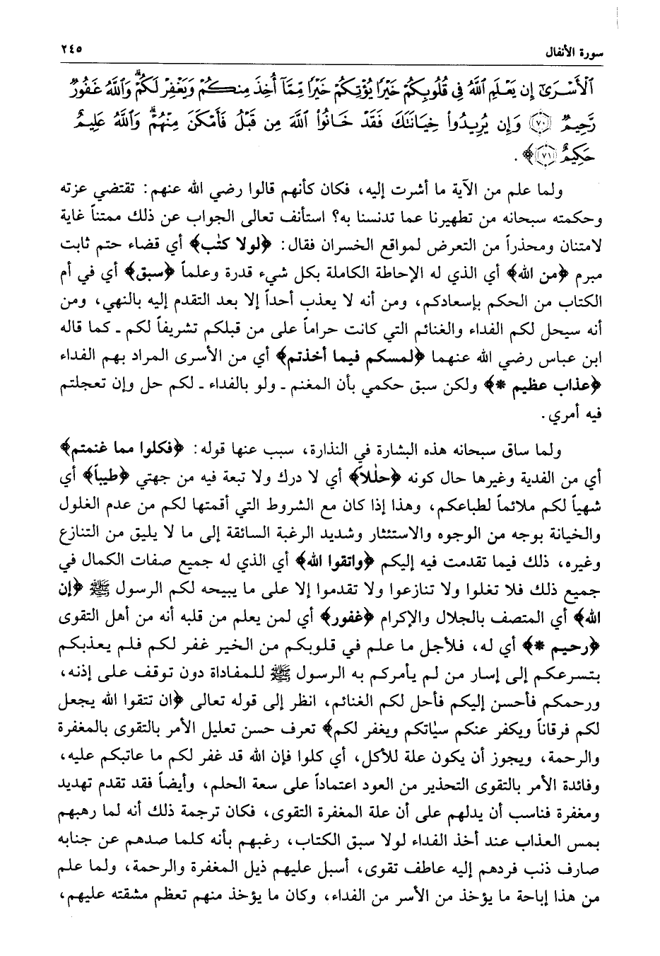 الأَسْرَى إِن يَعْلَمِ اللَّهُ فِي قُلُوبِكُمْ خَيْراً يُؤْتِكُمْ خَيْراً مِّمَّآ أُخِذَ مِنكُمْ وَيَغْفِرْ لَكُمْ وَاللَّهُ غَفُورٌ رَّحِيمٌ وَإِن يُرِيدُواْ خِيَانَتَكَ فَقَدْ خَانُواْ اللَّهَ مِن قَبْلُ فَأَمْكَنَ مِنْهُمْ وَاللَّهُ عَلِيمٌ حَكِيمٌ ) 73