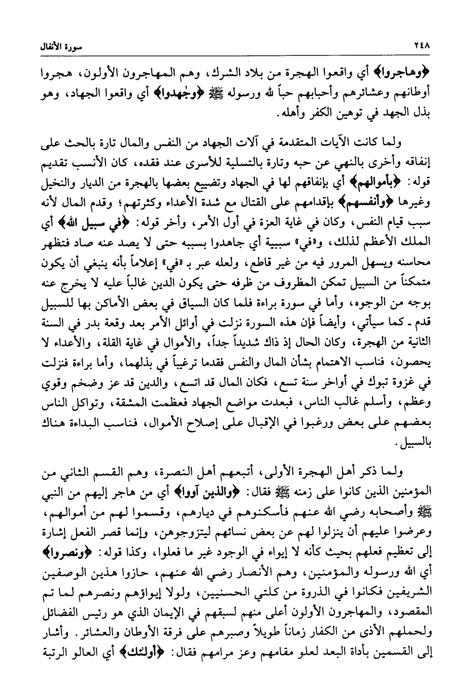 ولما كانت الآيات المتقدمه في آلات الجهاد من النفس والمال تارة بالحث على إنفاقه وأخرى بالنهي عن حبه وتارة بالتسلية للأسرى عند فقده ، كان الأنسب تقديم قوله : ( بأموالهم ) أي بإنفاقهم لها في الجهاد وتضييع بعهضها بالهجرة من الديار والنخيل وغيرها ) وأنفسهم ( بإقدامهم على القتال مع شدة الأعداء وكثرتهم ؛ وقدم المال لأنه سبب قيام النفس ، وكان في غاية العزة في أول الأمر ، وأخر قوله : ( في سبيل الله ) أي الملك الأعظم لذلك ، ( وفي ) سببية أي جاهدوا بسببه حتى لا يصد عنه صاد فتظهر محاسنه ويسهل المرور فيه من غير قاطع ، ولعله عبر ب ( في ) إعلاماً بأنه ينبغي أن يكون متمكناً من السبيل تمكن المظروف من ظرفه حتى يكون الدين غالباً عليه لا يخرج عنه بوجه من الوجوه ، وأما في سةرة نزلت في أوائل الأمر بعد وقعه بدر في السنة الثانية من الهجرة ، وكان الحال إذ ذاك شديداً جداً ، والأموال في غاية القلة ، والأعداد لا يحصون ، فناسب الاهتمام بشأن المال والنفس فقدما ترغيباً في بذلهما ، وأما براءة فنزلت في غزوة تبوك في أواخر سنة تسع ، فكان المال قد اتسع ، والدين قد عز وضخم وقي وعظم ، وأسلم غالب الناس ، فبعدت مواضع الجهاد فعظمت المشقة ، وتواكل الناس بعضهم على بعض ورغبوا في الإقبال على إصلاح الأموال ، فناسب البداءة هناك بالسبيل .