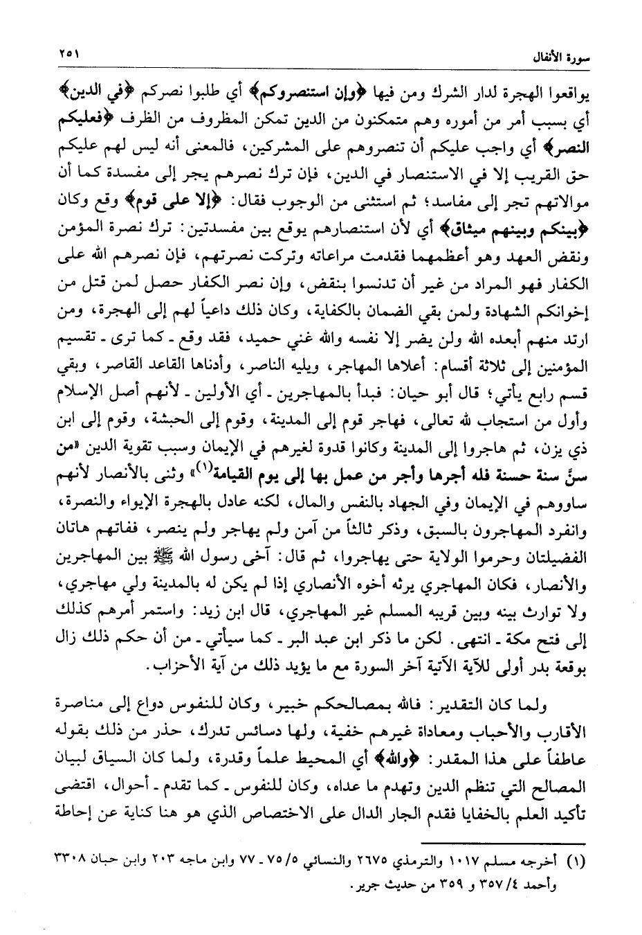يواقعوا الهجرة لدار الشرك ومن فيها ) وإن استنصرهم ) أي طلبوا نصركم ) في الدين ) أي بسبب امر من أموره وهم متمكنون من الدين تمكن المظروف من الظرف ) فعليكم النصر ) أي واجب عليكم ان تنصروهم على المشركين ، فالمعنى انه ليس لهم عليكم حق القريب إلا في الإستنصار في الدين ، فإن ترك نصرهم يجر إلى مفسده كما أن موالاتهم تجر إلى مفاسد ؛ ثم استثنى من الوجوب فقال : ( إلا على قوم ( وقع وكان ) بينكم وبينهم ميثاق ) أي لأن استنصارهم يوقع بين المفسدين : ترك نصرة المؤمن ونقض العهد وهو اعظمهما فقدمت مراعاته وتركت نصرتهم ، فإن نصرهم الله على الكفار فهو المراد من غير أن تدنسوا بنقض ، وغن نصر الكفار حصل لمن قتل من إخوانكم الشهادة ولمن بقي الضمان بالكفاية ، وكان ذلك داعياً لهم إلى الهجرة ، ومن ارتد منهم أبعده الله ولن يضر إلا نفسه والله غنى حميد ، فقد وقع - كما ترى - تقسيم المؤمنين إلى ثلاثة اقسام : أعلاها المهاجر ، ويليه الناصر ، وادناها القاعد القاصر ، وبقي قسم رابع ياتي ؛ قال أبو حيان : فبدأ بالمهاجرين - أي الأولين - لأنهم أصل الإسلام وأول من استجاب لله تعالى ، فهاجر قوم إلى المدنية ، وقوم إلى الحبشة ، وقوم إلى ابن ذي يزن ، ثم هاجروا إلى المدينة وكانوا قدوة لغيرهم في الإيمان وسبب تقوية الدين ( من سنَّ سنة حسنة فله أجرها وأجر من عمل بها إلى يو القيامه ) وثنى بالأنصار لأنهم ساووهم في الإيمان وفي الجهاد بالنفس والمال ، لكنه عادل بالهجرة الإيواء والنصرة ، وانفراد المهاجرين بالسبق ، وذكر ثالثاً من آمن ولم يكن له بالمدينة ولي مهاجرين ، ولا توارث بينه قربية المسلم غير المهاجرين ، قال ابن زيد : واستمر امرهم كذلك بوقعه بدر أولى للآية الآتية آخر السورة مع ما يؤيد ذلك من ىية الأحزاب ولما كان التقدير : فالله بمصالحهم خبير ، وكان للنفوس دواع إلىى مناصرة الأقارب والأحباب ومعاداة غيرهم خفية ، ولها دسائس تدرك ، حذرمن ذلك بقوله عاطفاً على هذا المقدر : ( والله ) أي المحيط علماً وقدرة ، ولما كان السياق لبيان المصالح التي تنظم الدين وتهدم ما عداه ، وكان للنفوس - كما تقدم - أحوال ، اقتضى تأكيد العلم بالخفاوة فقدم الجار الدال على الاختصاصالذي هو هنا كناية عن إحاطة