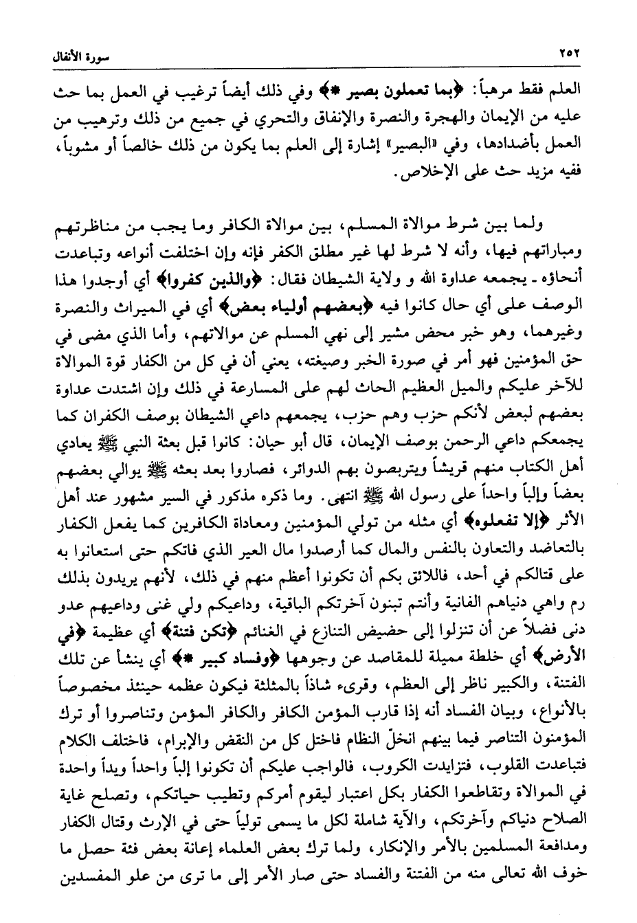 ولما بين شرط موالاة المسلم ، بين مولاة الكافر وما يجب من مناظرتهم ومبارتهم فيها ، وأنه لا شرط لها غير مطلق الكفر فإنه وإن اختلفت انواعه وتباعدت انحاؤه - يجمعه عداوه الله و ولاية الشيطان فقال : ( والذين كفروا ) أي أوجدوا هذا الوصف على أي حال كانوا فيه ) بعضهم أولياء بعض ) أي في الميراث والنصرة وغيرهما ، وهو خبر محض مشير إلى نهي المسلم عن موالاتهم ، وأما الذي مضى في حق المؤمنين فهو أمرصورة الخبر وصيغته ، يعني ان في كل من الكفار قوة الموالاة للآخر عليكم والميل العظيم الحاث وهم حزب ، يجمعهم داعي الشيطان بوصف الكفران كما يجمعكم داعي الرحمن بوصف الإيمان ، قال أبو حيان : كانوا قبل بعثة النبي ( صلى الله عليه وسلم ) يعادي أهل الكتاب منهم قريشاً ويتربصون بهم الدوائر ، فصاروا بعد بعثه النبي صلى الله عليع وسلم يوالي الأثر ) إلا تفعلوه ( اي مثله من تولي المؤمنين ومعاداة االكافرين كما يفعل الكفار بالتعاضد والتعاون بالنفس والمال كما ارصدوا مال العير الذي فاتكم حتى استعانوا به على قتالكم في أحد ، فاللائق بكم أن تكونوا أعظم منهم في ذلك ، لأنهم يريدون بذلك رم واهي دنياهم الفانية وأنتم تبنون آخرتكم الباقية ، وداعيكم ولي غنى وداعيهم عدو دنى فضلاً عن ان تنزلوا إلى حضيض التنازع في الغنائم ) تكن فتنة ) أي عظيمة ) في الأرض ( اي خلطة مميلة للمقاصد عن وجوهها ) وفساد كبير ) أي ينشأ عن تلك الفتنة ، والكبير ناظر إلى العظم ، وقرئ شاذاً بالمثلثة فيكون عظمة حينئذ مخصوصاً بالأنواع ، وبيان الفسادأنه غذا قارب المؤمن الكافر والكافر المؤمن وتناصروا أو ترك المؤمنون التناصر فيما بينهم انخّل النظام فاختل كل من النقض والإبرام ، فاختلف الكلام فتباعدت القلوب ، فتزايدت الكروب ، فالواجب عليكم أن تكونوا إلباً واحداً ويداً واحدة في الموالاة وتقاطعوا الكفار بكل اعتبار ليقوم أمركم وتطيب حياتكم ، وتصلح غاية الصلاح دنياكم وآخرتكم ، والآية شاملة لكل ما يسمى تولياً حتى في الإرث وقتال الكفار ومدافعة المسلمين بالأمر والإنكار ، ولما ترك بعض العلماء إعانة بعض فئة حصل ما خوف الله تعالى منه من الفتنة والفساد حتى صار الأمر إلى ما ترى من علو المفسدين