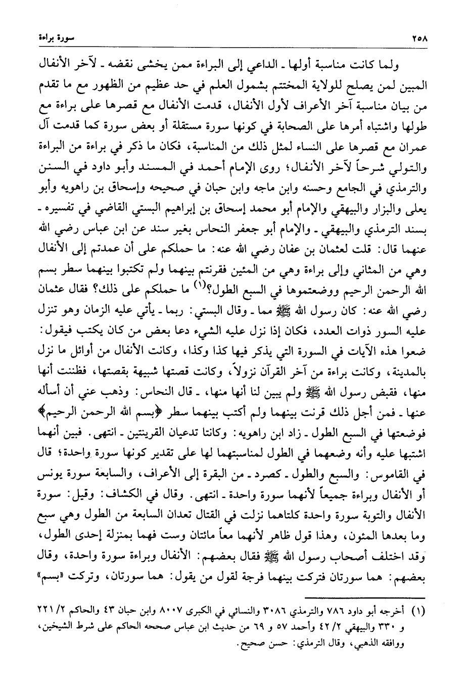 ولما كانت مناسبة أولها - الداعي إلى البراءة مم ن يخشى نقضه - لآخر الأنفال المبين لمن يصلح للولاية المختتم بشمول العلم في حد عظيم من الظهور مع ما تقدم من بيان مناسبة آخر الأعراف لأول الأنفال ، قدمت الأنفال مع قصرها على براءة مع طولها واشتباه أمرها على الصحابة في كونها سورة مستقلة أو بعض سورة كما قدمت آل عمران مع قصرها على النساء لمثل ذلك من المناسبة ، فكان ما ذكر في براءة من البراءة والتولي شرحا لآخر الأنفال ، روى الإمام أحمد يفي المسند وأبو داود في السنن والترمذي في الجامع وحسنه وابن ماجه وابن حبان في صحيحه وإسحاق بن راهويه وأبو يعلى والبزار والبيهق يوالإمام أبو محمد إسحاق بن إبراهيم البستس القاضي في تفسيره - بسند الترمذي والبيهقي - والإمام أبو جعفر النحاس بغير سند عن ابن عباس رضي الله عنهما قال : قلت لعثمان بن عفان رضي الله عنه : ما حملكم على أن عندتم إلى الأنفال وهي من المثاني وإلى براءة وهي من المئين فقرنتم بينهما ولم تكتبوا بينهما سطرا بسم الله الرحمن الرحيم ووضعتموهما في السبع الطول ؟ ما حملكم على ذلك ؟ فقال عثمان رضي الله عنه : كان رسول الله ( صلى الله عليه وسلم ) مما - وقال الستي : ربما - يأتي عليه الزمان وهو تنزل عليه السور ذوات العدد ، فكان إذا نزل عليه الشيء دعا بعض من كان يكتب فيقول : ضعوا هذه الآيات في السورة التي يذكر فيها كذا وكذا ، وكانت الأنفال من أوائل ما نزل بالمدينة ، وكانت براءة من آخر القرآن نزولا ، وكانت فصتها شبيهة بقصتها ، فظننت أنها منها ، فقبض رسول الله ( صلى الله عليه وسلم ) ولم يبين لنا أنها منها ، قال النحاس : وذهب عني أ ، أسأله عنعا ، فمن أجل ذلك قرنت بينهما ولم أكتب بينهما سطر ) بسم الله الرحمن الرحيم ( فوضعتها في السبع الطول - زاد ابن راهويه : وكانتا تدعيان القرينتين - انتهى. فبين أنهما اشتبها عليه وأنه وضعهما في الطول لمناسبتهما لها على تقدير كونها سورة واحدجة ، قال في القاموس : والسبع الطول - كصرد - من البقرة إلى الأعراف ، والسابعة سورة يونس أو الأنفال وبراءة جميعا لأنهما سورة واحدة - انتهى. وقال في الكشاف : وقيل : سورة الأنفال والتوية سورة واحدة كلتاهما نزلت في القتال تعدان اتلسابعة من الطول ةبعدها المئون ، وهذا قول ظاهر لأنهما معا مائتان وست فهما بمنزلة سورة واحدة ، وقال بعضهم : هما سورتان فتركت بينهما فرجة لقول من يقول : هما سورتان ، وتركت " بسم "