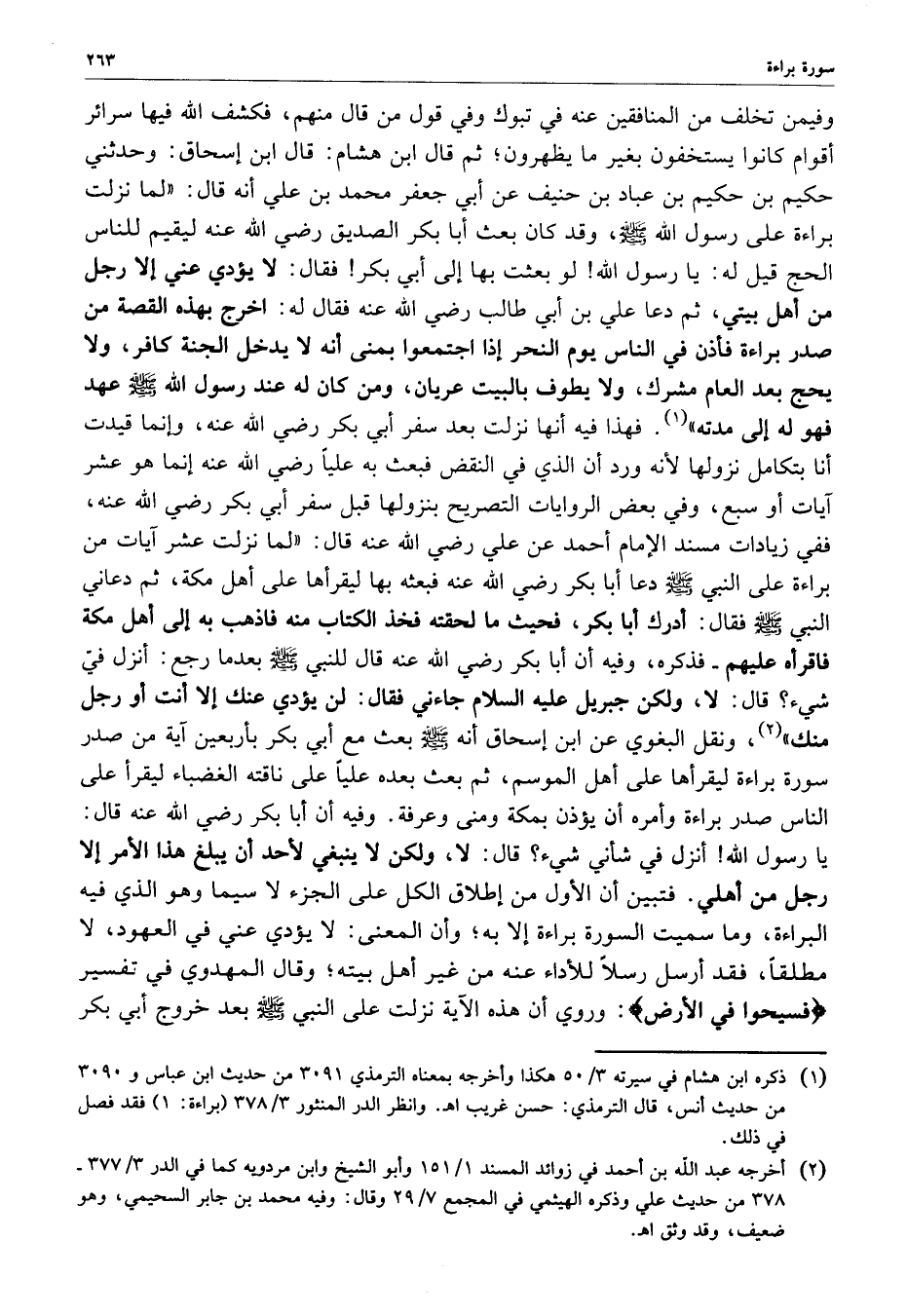 وفيمن تخلف من المنافقين عنه في تبوك وفي قول من قال منهم ، فكشف الله فيها سرائر أقوام كانوا يستخفون بغير ما يظهرون ؛ ثم قال ابن هشام : قال ابن اسحاق : وحدثني حكيم بن حكيم بن عباد بن حنيف عن أبي جعفر محمد بن علي أنه قال : ( لما نزلت براءة على رسول الله ( صلى الله عليه وسلم ) ، وقد كان بعث أبا بكر الصديق رضي الله عنه ليقيم للناس الحج قيل له : يارسول الله لو بعثت بها إلى أبي بكر فقال : ( لا يؤدي عني إلا رجل من أهل بيتي ، ( ثم دعا علي بن أبي طالب رضي الله عنه فقال له : ( اخرج بهذه القصة من صدر براءة فأذن في الناس يوم النحر إذا اجتمعوا بمنى أنه لا يدخل الجنة كافر ، ولا يجح بعد العام مشرك ، ولا يطوف بالبيت عريان ، ومن كان له عند رسول الله ( صلى الله عليه وسلم ) عهد فهو له إلى مدته ( .