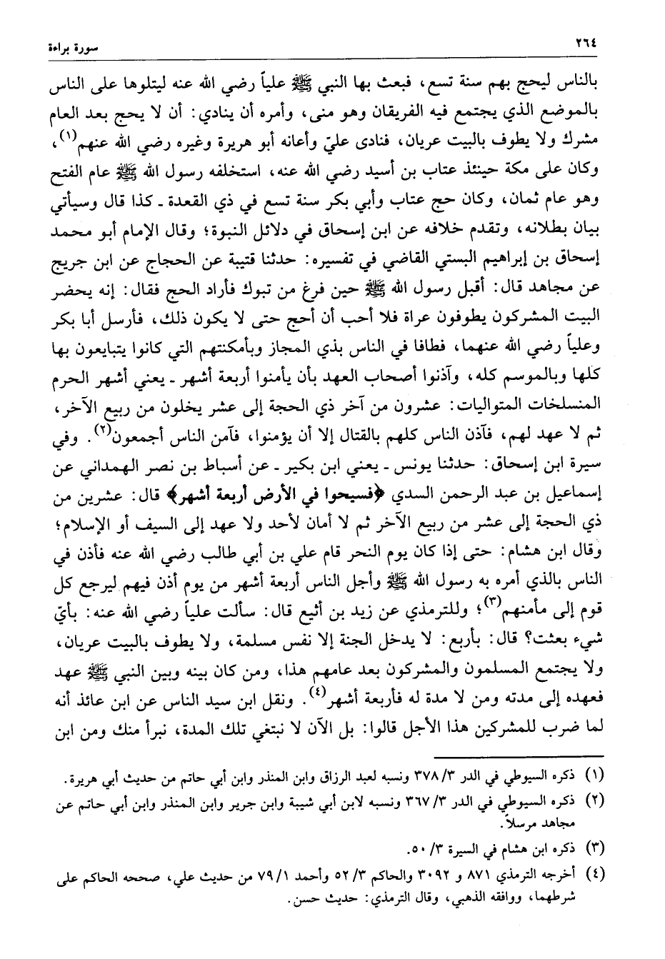وفي سيرة ابن اسحاق : حدثنا يونس - يعني ابن كثير - عن اسباط بن نصر الهمداني عن إسماعيل بن عبد الرحمن السدي ) فسيحوا في الأرض أربعة اشهر ( قال : عشرين من ذي الحجة إلى عشر من ربيع الآخر ثم لا أمان لأحد ولا عهد إلى السيف أو الإسلام ؛ وقال ابن هشام : حتى إذا كان يوم النحر قام علي بن أبي طالب رضي الله عنه فأذن في الناس بالذي امره به رسول الله ( صلى الله عليه وسلم ) وأجل الناس أربعة اشهر من يوم أذن فيهم ليرجع كل قوم إلى مأمنهم ؛ وللترمذي عن زيد بن أثيع قال : سألت علياً رضي الله عنه : بأيّ شيء بعثت ؟ قال : باربع : لا يدخل الجنة إلا نفس مسلمة ، ولا يطوف بالبيت عريان ، فعهده إلى مدته ومن لا مدة له فأربعة أشهر ونقل ابن سيد الناس عن ابن عائذ انه لما ضرب للمشركين هذا الأجل قالوا : بل تلآن لا ينبغي تلك المدة ، نبرأ منك ومن ابن