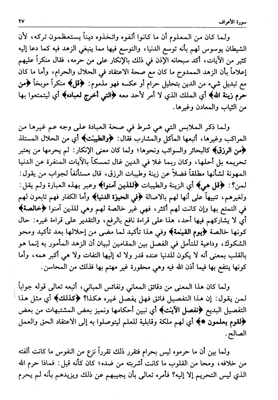 ولما كان من المعلوم أن ما كانوا الفوه واتخذوه ديناً يستعظمون تركه ، لأن الشيطان يوسوس لهم بأنه توسع الدنيا ، والتوسع فيها مما ينبغي الزهد فيه كما دعا غليه كثير نت الآيات ، اكد سبحاته الإذن في ذلك بالإنكار على من حرمه ، فقال منكراً عليهم إعلاماً بأن الزهد الممدوح ما كان مع صحة الإعتقاد في الحلال والحرام وأما ما كان مع تبديل شيء من الدين بتحليل حرام أو عكسه فهو مذموم : ( قل ( منكراً موبخاً ) من حرم زينة الله ( أ ي الملك الذي لا امر لأحد معه ) التي أخرج لعباده ) أي ليتمتعوا بها من الثياب والمعادن وغيرها. ولما ذكر الملابس التي هي شرط في صحة العبادة على وجه عم غيرها من المراكب وغيرها ، أتبعها المآكل والمشارب فقال : ( والطيبات ( اب من الحلال المستلذ ) من الرزق ( كالبحائر والسوائب ونحوها ؛ ولما كان معنى الإنكار : لم يحرمها من يعتبر تحريمه بل أحلها ، وكان ربما غلا في الدين غال تمسكاً بالآيات المنفرة عن الدينا المهونة لشأنها مطلقاً فضلاً عن زينة وطيبات الرزق ، قال مستأنفاً لجواب من يقول : لمن ؟ : ( قل هي ) أي زينة والطيبات ) للذين آمنوا ( وعبر بهذه العبارة ولم يقل : ولغيرهم ، تنبيهاً على أنها لهم بالأصالة ) في الحياة الدنيا ( في التمتع بها أكثر ، فهي غير خالصة لهم وهي للذين آمنوا ) خالصة ) أي لا يشاركهم فيها أحد ، هذا على قراءة نافع بالرفع ، والتقدير على قراءة غيره : حال كونها خالصة ) يوم القيامة ( وفي هذا نأكد لما مضى منإحلالها بعد تاكد ومحور الشكوك ، وداعية للتأمل في الفصل بين المقامين لبيان أن الزهد المأمور به إنما هو بالقلب بمعنى أنه لا يكون للدنيا عنده قدر ولا له إليها التفات ولا هي اكبر همه ، وأما بالقلب بمعنى انه لا يكون للدنيا عنده قدر ولا له إليها التفات ولا هي أكبر همه ، واما كونها ينتفع بها فيما أذن الله فيه وهي محقورة غير مهتم بها فذلك من المحاسن ولما كان هذا المعنى من دقائق المعاني ونفائس المباني ، أتبعه تعالى قوله جواباً لمن يقول : إن هذا التفصيل فائق فهل يفصل غيره هكذا ؟ ) كذلك ) أي مثل هذا التفصيل البديع ) نصل الايات ) أي نبين أحكامها ونميز بعض المشبهات من بعض ) لقوم يعلمون ) أي لهم ملكة وقابلية للعلم ليتوصلوا به إلى الإعتقاد الحق والعمل الصالح