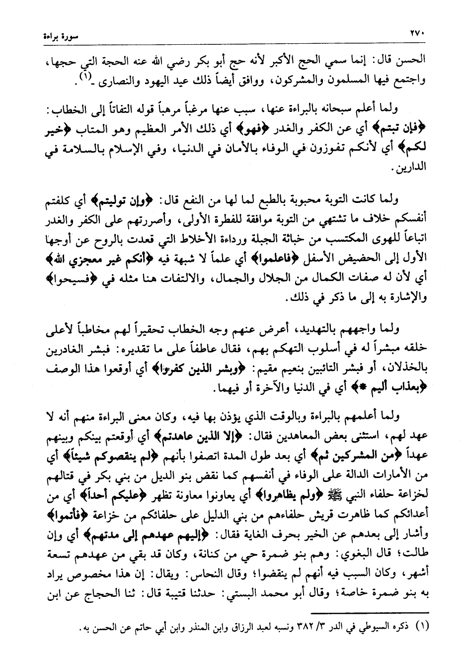 الحسن قال : إنما سمي الحج الأكبر لأنه حج أبو بكر رضي الله عنه الحجة التي حجها ، واجتمع فيها المسلمون والمشركون ، ووافق ذلك عيد اليهود والنصارى - ولما أعلم سبحانه بالبراءة عنها ، سبب عنها مرغباً مرهباً قوله التفاتاً إلى الخطاب : ( فإن تبتم ) أي عن الكفر والغدر ) فهو ( اي ذلك الأمر العظيم وهو المتاب ) خير لكم ) أي لأنكم تفوزون في الوفاء بالأمان في الدنيا ، وفي الإسلام بالسلامة في الدارين .