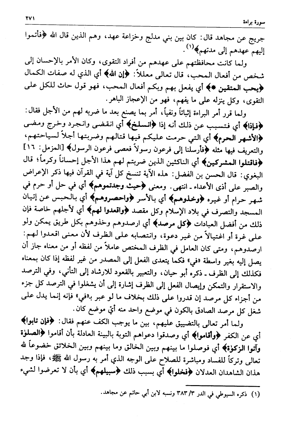 جريج عن مجاهد قال : كان بين بني مدلج وخزاعة عهد ، وهم الذين قال الله ) فاتموا إليهم عهدهم إلى مدتهم ( ولما كانت محافظتهم على عهدهم من افراد التقوى ، وكان الأمر بالإحسان إلى شخص من أفعال المحب ، قال تعالى معللاً : ( إن الله ) أي الذي له صفات الكمال ) يحب المتقين ) أي يفعل بهم وبكم افعال المحب ، فهو قول حاث للكل على التقوى ، وكل ينزله على ما يفهم ، فهو من الإعجاز الباهر .
