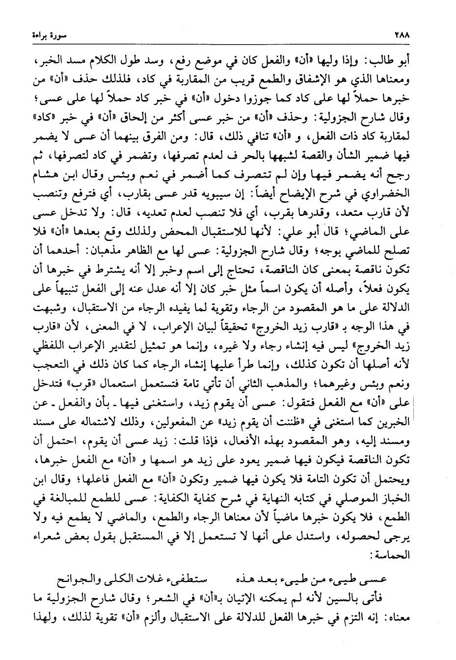 أبو طالب : وإذا وليها " أن " والفعل كان في موضع رفع ، وسد طول الكلام مسد الخبر ومعناها الذي هزو الإشفاق والطمع قريب من المقاربة في كاد ، فلذلك حذف " أن " من خبرها حملا لها على كاد كما جوزوا دخول " أن " في خبر كاد حملا على عسى ، وقال شارح الجزولية : وحذف " أن " من خبر عسى أكثر من إلحاق " أن " في خبر " كاد " لمقاربة كاد ذات الفعل ، و " أن " تنافي ذلك ، قال : ومن الفرق بينهما أن عسى ا يضمر فيها ضمير الشأن والقصة لشبهها بالحرف لعدم تصرفها وتضمر في كاد لتصرفها ، ثم رجح أنه يضمر فيها وإن لم تتصرف كما أضمر في نعم وبئس وقال ابن هشام الخضراوي في شرح الإيضاح أيضا : إن سبيويه قدر عسى بقارب ، أي فترفع وتنصب لأن قار بمتعد ، وقدرها بقرب ، أي يفلا تنصب لعدم تعديه ، قال : ولا تدخل عسى على الماضي ، قال أبو علي : لأنها للاستقبال المحض ولذلك وقع بعدها " أن " فلا تصلح للماضي بوجه ، وقال شارح الجزولية : عسى لها الظاهر مذهبان : أحدهما أن تكون ناقصة بمعنى كان الناقصة ، تحتاج إلى اسم وخبر إلا أنه يشترط في خبرها أن يكون فعلا ، وأصله أن يكون اسما مثل خبر كان إلا أنه عدل عنه إلى الفعل تنبيها على الدلالة على ما هو المقصود من ارجاء وتقوية لما يفيده الرجاء من الاستقبال ، وشبهت في هذا الوجه ، ب " قارب زيد الخروج " تحقيقا لبيان الإعراب لا في المعنى ، لأن " قار بزيد الحروج " ليس فيه إنشاء رجاء ولا غيره ، وإنماهو تمثيل لتقدير الإعراب اللفظي لأنه أصلها أن تكون كذلك وإنما طرأ عليها إنشاء الرجاء كما كان ذلك في التعجب ونعم وبئس وغيرهما ، والمذهب الثاني أن تأتي تامة فتستعمل استعمال " قرب " فتدخل على " أن " مع الفعل فتقول : عسى أن يقوم زيد ، واستغنى فيها - بأن والفعل - عن الخبرين كما استغنى في " ظننت أن يقوم زيد " عن المفعولين ، وذلك لاشتماله على مسند ومسند إليه ، وهو المقصوج بهذه الأفعال ، فإذا قلت : زيد عسى أن يقوم احتمل أن تكون ناقصة فيكون فيها ضمير يعود على زيد هو اسمها و " أن " مع الفعل خبرها ، ويحتمل أن تكون التامة فلا يكون فيها ضمير وتكون " أن " مع الفعل فاعلها ، وقال ابن الخباز الموصلي في كتابه النهاية في شرح كفاية الكفاية ، عسى للطمع للمبالغة في الطمع ، فلا يكون خبرها ماضيا لأن معناها الرجاء والطمع ، والماضي لا يطمع فيه ولا يرجى حصوله ، واستدل على أنها لا تستعمل إلا في المستقبل بقول بعض شعراء الحماسة :