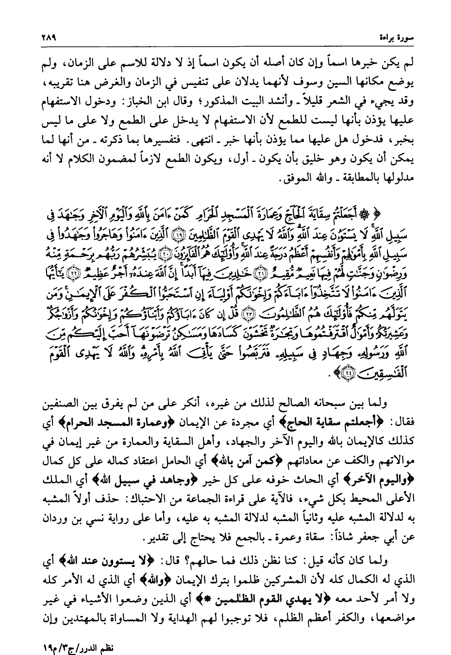 ) أَجَعَلْتُمْ سِقَايَةَ الْحَاجِّ وَعِمَارَةَ الْمَسْجِدِ الْحَرَامِ كَمَنْ آمَنَ بِاللَّهِ وَالْيَوْمِ الآخِرِ وَجَاهَدَ فِي سَبِيلِ اللَّهِ لاَ يَسْتَوُونَ عِندَ اللَّهِ وَاللَّهُ لاَ يَهْدِي الْقَوْمَ الظَّالِمِينَ الَّذِينَ آمَنُواْ وَهَاجَرُواْ وَجَاهَدُواْ فِي سَبِيلِ اللَّهِ بِأَمْوَالِهِمْ وَأَنْفُسِهِمْ أَعْظَمُ دَرَجَةً عِندَ اللَّهِ وَأُوْلَئِكَ هُمُ الْفَائِزُونَ يُبَشِّرُهُمْ رَبُّهُم بِرَحْمَةٍ مِّنْهُ وَرِضْوَانٍ وَجَنَّاتٍ لَّهُمْ فِيهَا نَعِيمٌ مُّقِيمٌ خَالِدِينَ فِيهَآ أَبَداً إِنَّ اللَّهَ عِندَهُ أَجْرٌ عَظِيمٌ يأَيُّهَا الَّذِينَ آمَنُواْ لاَ تَتَّخِذُواْ آبَآءَكُمْ وَإِخْوَانَكُمْ أَوْلِيَآءَ إَنِ اسْتَحَبُّواْ الْكُفْرَ عَلَى الإِيمَانِ وَمَن يَتَوَلَّهُمْ مِّنكُمْ فَأُوْلَئِكَ هُمُ الظَّالِمُونَ قُلْ إِن كَانَ آبَاؤُكُمْ وَأَبْنَآؤُكُمْ وَإِخْوَانُكُمْ وَأَزْوَاجُكُمْ وَعَشِيرَتُكُمْ وَأَمْوَالٌ اقْتَرَفْتُمُوهَا وَتِجَارَةٌ تَخْشَوْنَ كَسَادَهَا وَمَسَاكِنُ تَرْضَوْنَهَآ أَحَبَّ إِلَيْكُمْ مِّنَ اللَّهِ وَرَسُولِهِ وَجِهَادٍ فِي سَبِيلِهِ فَتَرَبَّصُواْ حَتَّى يَأْتِيَ اللَّهُ بِأَمْرِهِ وَاللَّهُ لاَ يَهْدِي الْقَوْمَ الْفَاسِقِينَ ( ( )