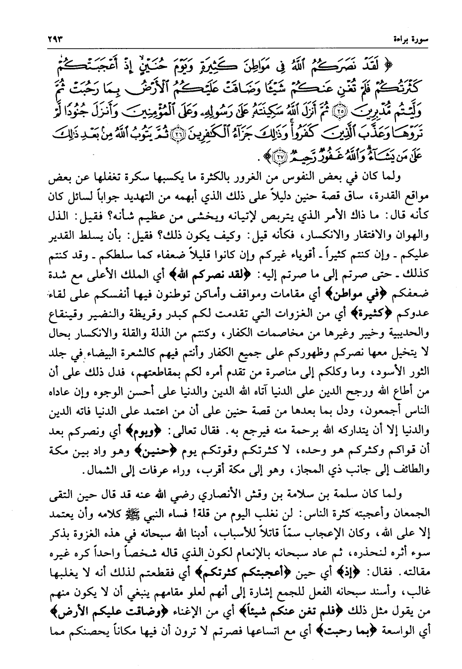 ) لَقَدْ نَصَرَكُمُ اللَّهُ فِي مَوَاطِنَ كَثِيرَةٍ وَيَوْمَ حُنَيْنٍ إِذْ أَعْجَبَتْكُمْ كَثْرَتُكُمْ فَلَمْ تُغْنِ عَنكُمْ شَيْئاً وَضَاقَتْ عَلَيْكُمُ الأَرْضُ بِمَا رَحُبَتْ ثُمَّ وَلَّيْتُم مُّدْبِرِينَ ثُمَّ أَنَزلَ اللَّهُ سَكِينَتَهُ عَلَى رَسُولِهِ وَعَلَى الْمُؤْمِنِينَ وَأَنزَلَ جُنُوداً لَّمْ تَرَوْهَا وَعذَّبَ الَّذِينَ كَفَرُواْ وَذلِكَ جَزَآءُ الْكَافِرِينَ ثُمَّ يَتُوبُ اللَّهُ مِن بَعْدِ ذلِكَ عَلَى مَن يَشَآءُ وَاللَّهُ غَفُورٌ رَّحِيمٌ ( ( )