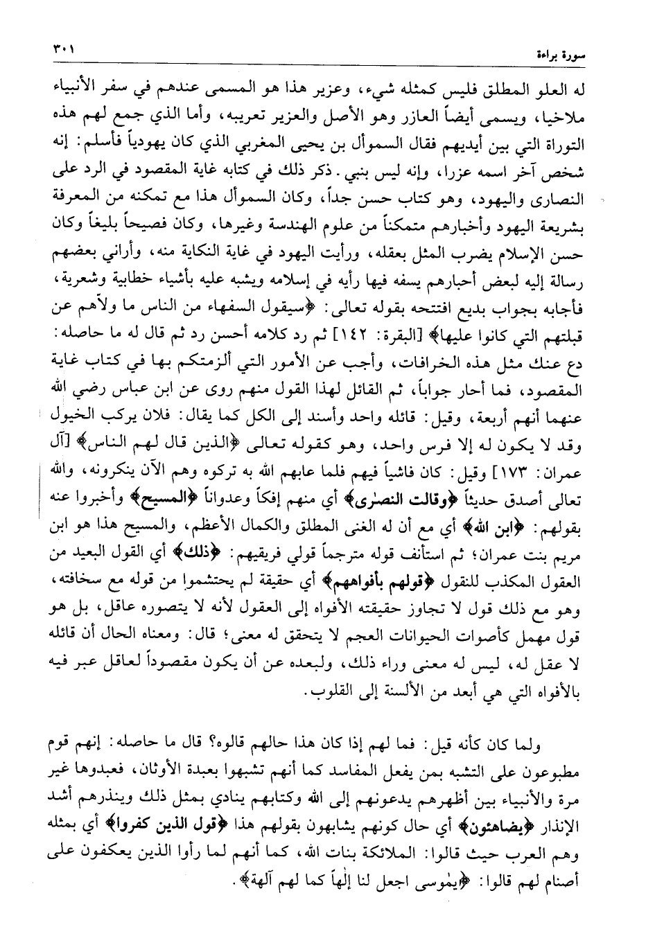 له العلو المطلق فليس كمثله شيء ، وعزير هذا هو المسمى عندهم في سفر الأنبياء ملاخيا ، ويسمى أيضاً العازر وهو الأصل والعزير تعريبه ، وأما الذي جمع لهم هذه التوراة التي بين ايديهم فقال السمؤال بن يحيى المغربي الذي كان يهودياً فأسلم : إنه شخص آخر اسمه عزرا ، وإنه ليس بنبي. ذكر ذلك في كتابه غاية المقصود في الرد على النصارى واليهود - وهو كتاب حسن جداً ، وكان السموأل هذا مع تمكنه من المعرفة بشريعة اليهود واخبارهم متمكناً من علوم الهندسة وغيرها ، وكان فصيحاً بليغاً وكان حسن الإسلام يضرب المثل بعقله ، ورأيت اليهود في غاية النكاية منه ، وأراني بعضهم رسالته إليه لبعض أحبارهم يسفه فيها رايه في إسلامه ويشبه عليه بأشياء خطابيه وشعرية ، فأجابه بجواب بديع افتتحه بقوله تعالى :