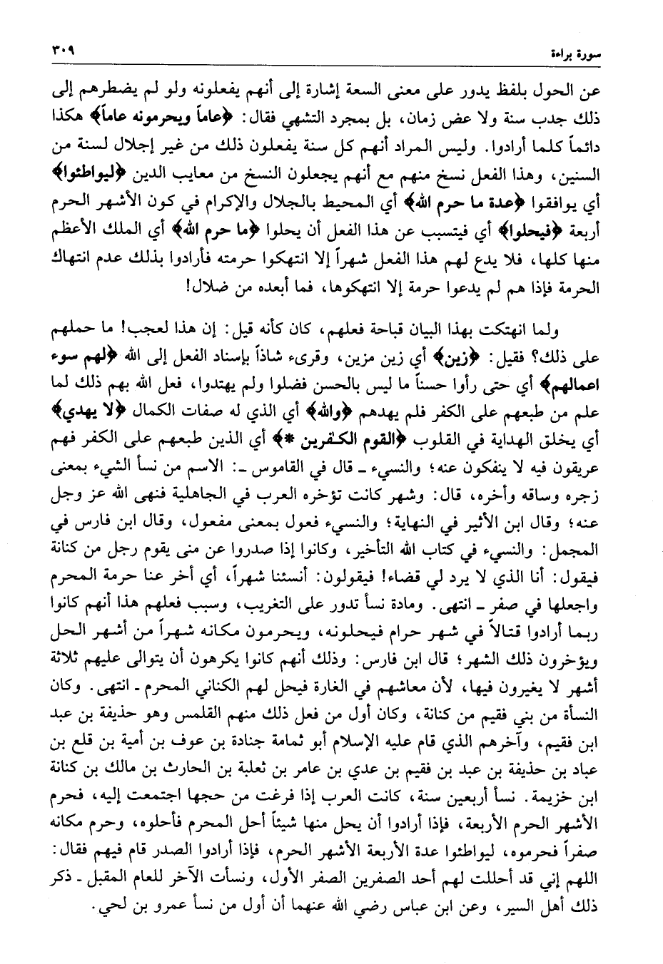 عن الحول بلفظ يدور على معنى السعة إشارة إلى أنهم يفعلونه ولو لم يضطرهم إلى ذلك جدب سنة ولا عض زمان ، بل بمجرد التشهي فقال : ( عاماً ويحرمونه عاماً ( هكذا دائماً كلما أرادوا. وليس المراد أنهم كل سنة يفعلون ذلك من غير إجلال لسنة من السنين ، وهذا الفعل نسخ منهم مع أنهم يجعلون النسخ من معايب الدين ) ليواطئوا ) أي يوافقوا ) عدة ما حرم الله ) أي المحيط بالجلال والإكرام في كون الأشهر الحرم اربعة ) فيحلوا ) أي فيتسبب عن هذا الفعل ان يحلوا ) ما حرم الله ) أي الملك الأعظم منها كلها ، فلا يدع لهم هذا الفعل شهراً إلا انتهكوا حرمته فأرادوا بذلك عدم انتهاك الحرمة فإذا هم لم يدعوا حرمة غلا انتهكوها ، فما ابعده من ضلال ولما انهتكت بهذا البيان قباحة فعلهم ، كان كأنه قيل : إن هذا لعجب ما حملهم على ذلك ؟ فقيل : ( زين ) أي زين مزين ، وقرئ شاذاً الفعل إلى الله ) لهم سوء اعمالهم ( علم من طبعهم على الكفر فلم يهدهم ) والله ) أي الذي له صفات الكمال ) لا يهدي ( اي يخلق الهداية في القلوب ) القوم الكافرين ) أي الذي طبعهم على الكفر فهم عريقون فيه لا ينفكون عنه ؛ والنسيء - قال في القاموس - : الاسم من نسا الشيء بمعنى زجره وساقه وأخره ، قال : وشهر كانت تؤخر العرب في الجاهلية فنهى الله عزوجل عنه ؛ وقال ابن الأثير في النهاية ؛ والنسيء فعول بمعنى مفعول ، وقال ابن فارس في المجمل : والنسيء في كتاب الله التأخير ، وكانوا إذا صدروا عن منى يقوم رجل من كنانة فيقول : أنا الذي لا يرد لي قضاء فيقولون : أنسئنا شهراً ، اي أخر عنا حرمة المحرم واجعلها في صفر - انتهى .