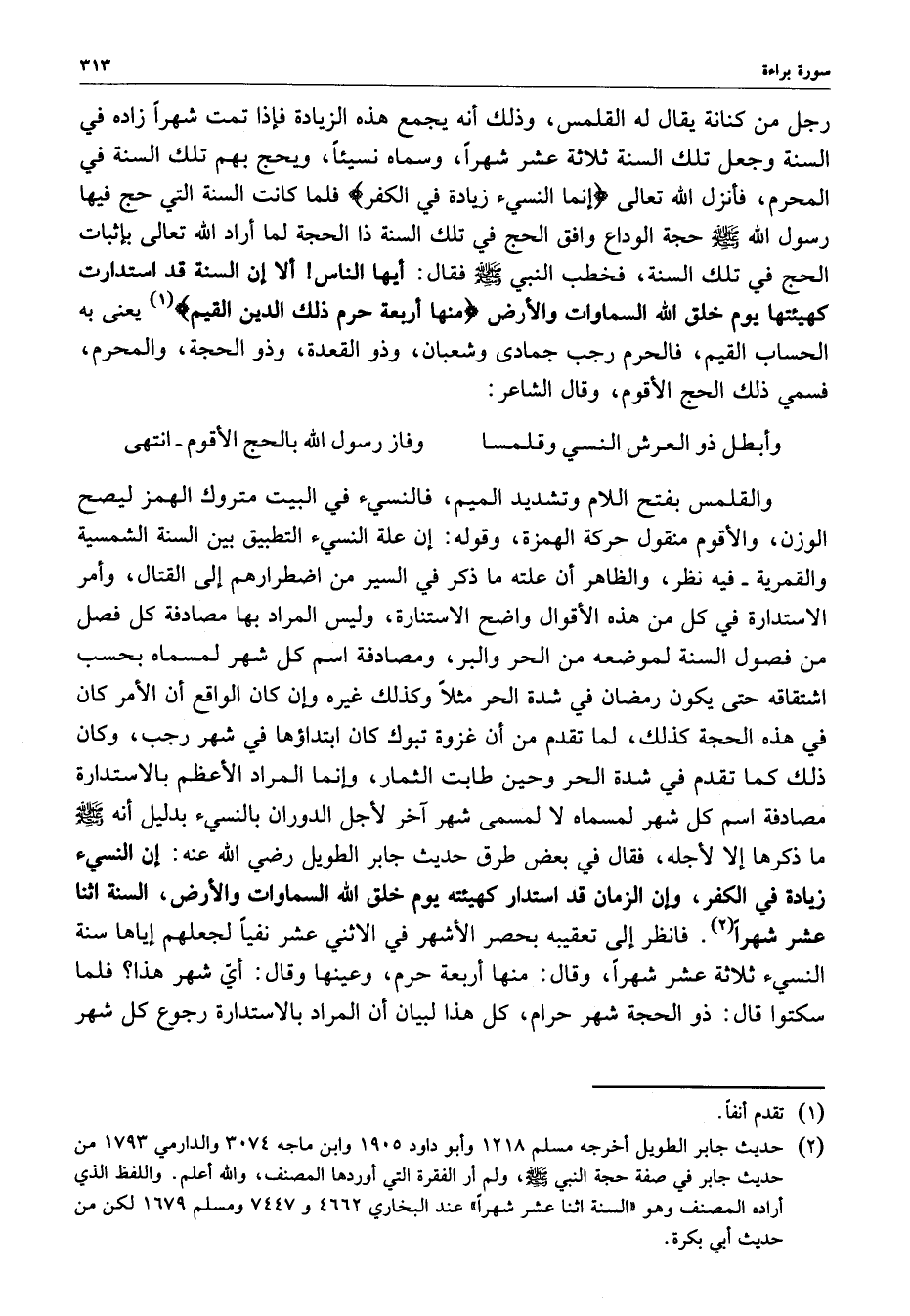 انتهى والقلمي بفتح اللام وتشديد الميم ، فالنسيء في البيت متروك الهمز ليصح الوزن ، والأقوام منقول حركة الهمزة ، وقوله : إن علة النسيء التطبيق بين السنة الشمسية والقمرية - فيه نظر ، والظاهر أن علته ما ذكر في السير من اضطرارهم إلى القتال ، وأمر الاستدارة في كل من هذه الأقوال واضح الاستنارة ، وليس المراد بها مصادفة كل فصل من فصول السنة لموضعه من الحر والبر ، ومصادفة اسم كل شهر لمسماه بحسب اشتقاقه حتى يكون رمضان في شدة الحر مثلاً وكذلك غيره وإن كان الواقع أن الأمر كان في هذه الحجة كذلك ، لما تقدم من أن غزوة تبوك كان ابتداؤها في شهر رجب ، وكان ذلك كما تقدم في شدة الحر وحين طابت الثمار ، وإنما المراد الأعظم بالاستدارة مصادفة اسم كل شهر آخر لأجل الدوران بالنسيء بدليل انه ( صلى الله عليه وسلم ) ما ذكر إلا لأجله ، فقال في بعض طرق حديث جابر الطويل رضي الله عنه ( إن النسيء زيادة في الكفر ، وإن الزمان قد استدار كهيئة يوم خلق الله السموات والأرض ، السنة اثنا عشر شهراً ) .