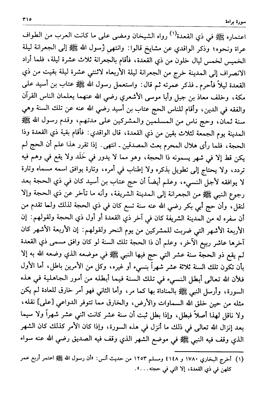 إذا تقرر هذا علم أن الحج لم يكن قط إلا في شهر يسمونه ذا الحجة ، وهو مما لا يدور في خَلَدَ ولا يقع في وهم فيه تردد ، ولا يحتاج إلى تطويل بذكره ولا إطناب في أمره ، وتارة يوافق اسمه مسماه وتارة لا يوافقه لأجل النسيء ، وعلم ايضاً أن حج عتاب بن أسيد كان في ذي الحجة بعد رجوع النبي ( صلى الله عليه وسلم ) من الجعرانه إلى المدينة الشريفة ، أنه ما تأخر عن ذي الحجة إلا لنقل ، وان حج أبي بكر رضي الله عنه سنة تسع كان ذي الحجة لذلك ولما تقدم من أن سفره له من المدينة الشريفة كان آخر ذي القعدة أو أول ذي الحجة ولقولهم : إن الأربعة الأشهر التي ضربت للمشركين من يوم النحر ولقولهم : إن الأربعة الأشهر كان آخرها عاشر ربيع الآخر ، وعلم ان ذا الحجة تلك السنة لو كان وافق مسمى ذي القعدة لم يقع ذو الحجة سنة عشر شهراً بنسيء أو غيره ، وكل من الأمرين باطل ، أما الأول فلأن الله تعالى ابطل النسيء في تلك السنة فيما ابطله من أمور الجاهلية في هذه السورة ، وأرسل النبي ( صلى الله عليه وسلم ) بالمناداة بها كما مر ، وأما الثاني فهو أمر خارق للعادة لم يكن مثله من حين خلق الله السماوات والأرض ، والخارق مما تتوفر الدواعي [ على ] نقله ، ولا ناقل لهذا أصلاً فبطل ، وإذا بطل ثبت أن سنة عشر كانت اثنى عشر شهراً ولا سيما بعد إنزال الله تعالى في ذلك ما أنزل في هذه السورة ، وإذا كان الأمر كذلك كان الشهر الذي وقف فيه النبي ( صلى الله عليه وسلم ) في موضع الشهر الذي وقف فيه الصديق رضي الله عنه سواء