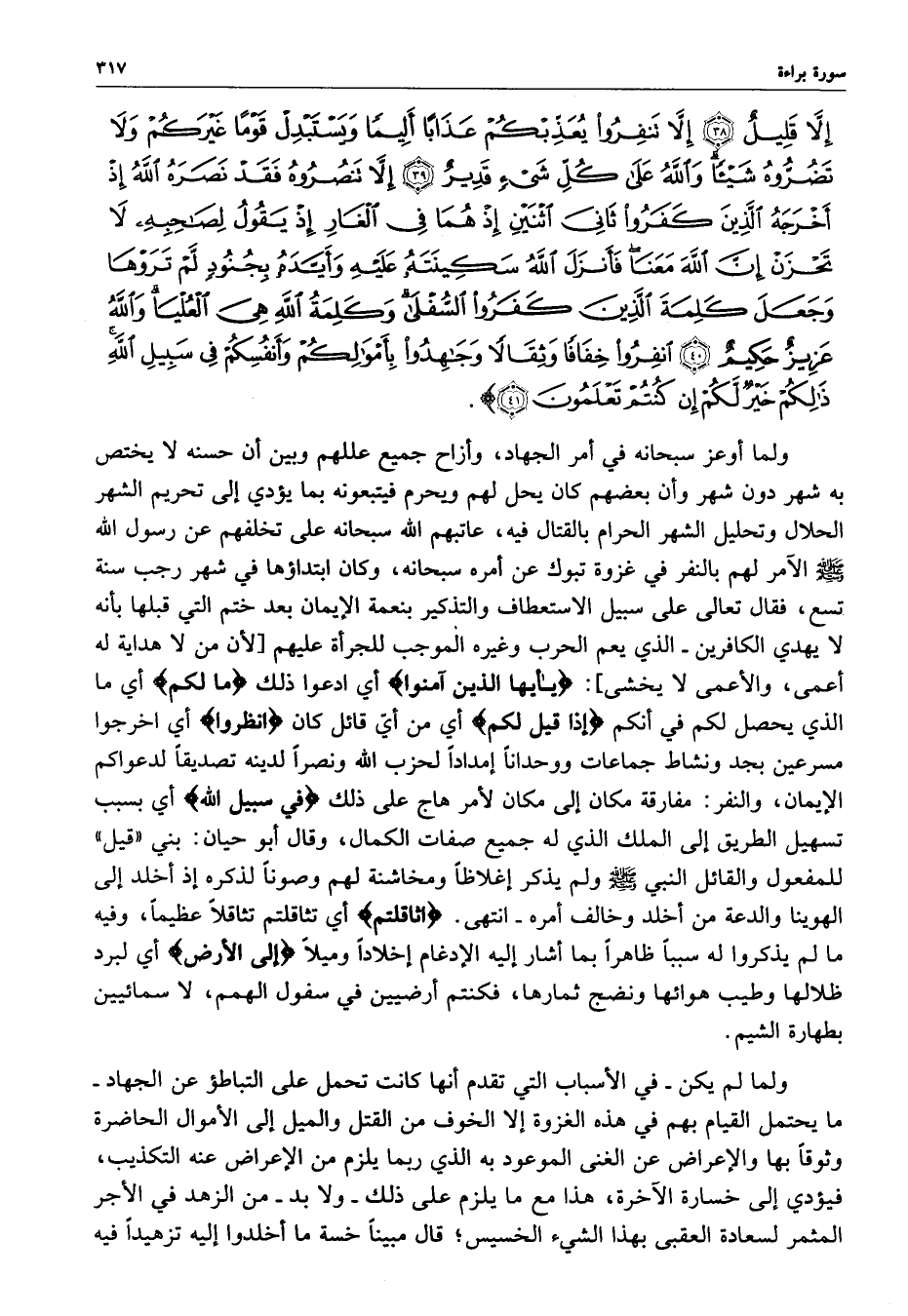 إِلاَّ قَلِيلٌ إِلاَّ تَنفِرُواْ يُعَذِّبْكُمْ عَذَاباً أَلِيماً وَيَسْتَبْدِلْ قَوْماً غَيْرَكُمْ وَلاَ تَضُرُّوهُ شَيْئاً وَاللَّهُ عَلَى كُلِّ شَيْءٍ قَدِيرٌ إِلاَّ تَنصُرُوهُ فَقَدْ نَصَرَهُ اللَّهُ إِذْ أَخْرَجَهُ الَّذِينَ كَفَرُواْ ثَانِيَ اثْنَيْنِ إِذْ هُمَا فِي الْغَارِ إِذْ يَقُولُ لِصَاحِبِهِ لاَ تَحْزَنْ إِنَّ اللَّهَ مَعَنَا فَأَنزَلَ اللَّهُ سَكِينَتَهُ عَلَيْهِ وَأَيَّدَهُ بِجُنُودٍ لَّمْ تَرَوْهَا وَجَعَلَ كَلِمَةَ الَّذِينَ كَفَرُواْ السُّفْلَى وَكَلِمَةُ اللَّهِ هِيَ الْعُلْيَا وَاللَّهُ عَزِيزٌ حَكِيمٌ انْفِرُواْ خِفَافاً وَثِقَالاً وَجَاهِدُواْ بِأَمْوَالِكُمْ وَأَنْفُسِكُمْ فِي سَبِيلِ اللَّهِ ذلِكُمْ خَيْرٌ لَّكُمْ إِن كُنتُمْ تَعْلَمُونَ ) 73