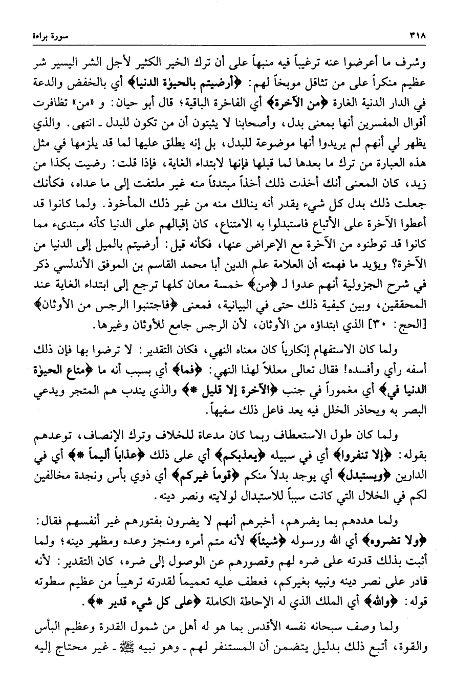 وشرف ما أعرضوا عنه ترغيباً منبهاً على أن ترك الخير الكثير لأجل الشر اليسير شر عظيم منكراً على من تثاقل موبخاً لهم : ( أرضيتم بالحياة النيا ( اي بالخفض والدعة في الدار الدنية الغارة ) من الآخرة ) أي الفاخرة الباقية ؛ قال أبو حيان : و ( من ) تظافرت اقوال المفسرين انها بمعنى بدل ، وأصحابنا لا يثبتون أن من تكون للبدل - انتهى .