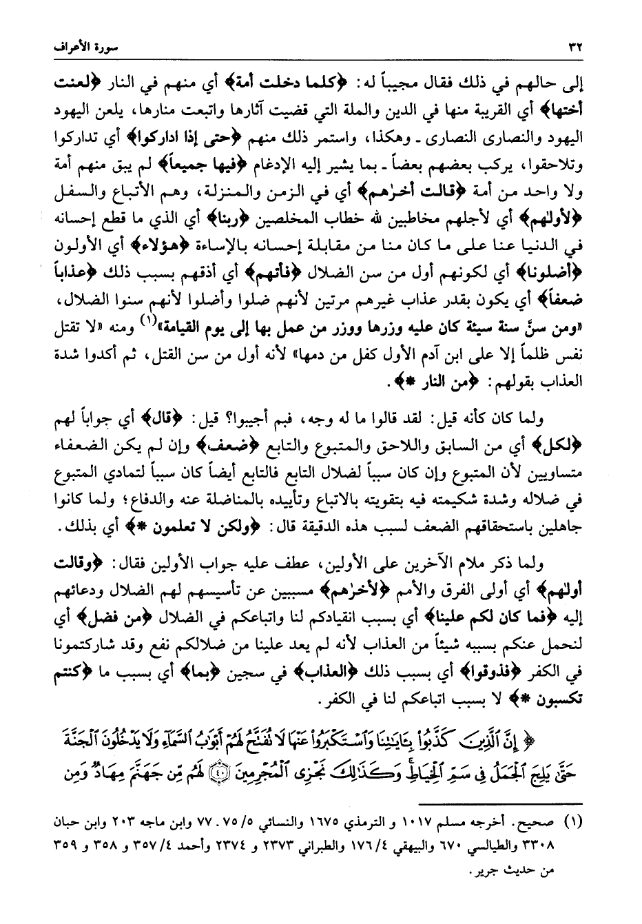 إلى حالهم في ذلك فقال مجيباً له : ( كلما دخلت أمه ) أي منهم في النار ) لعنت أختها ( اي القريبة منها في الدين والملة التي قضيت ىثارها واتبعت منارها ، يلعن اليهود اليهود والنصارى النصارى - وهكذا ، واستمر ذلك منهم ) حتى إذا اداركوا ( اي تداركوا وتلاحقوا ، يركب بعضهم بعضاً - بما يشير أليه افدغام ) فيها جميعاً ( لم يبق منهم أمة ولا واحد من أمة ) قالت أخراهم ( اي في الزمن والمنزلة ، وهم الأتباع والسفل ) لأولاهم ) أي لأجلهم مخاطبين لله خطاب المخلصين ) ربنا ) أي الذي ما قطع إحسانه في الدنيا عنا على ما كان منا من مقابلة إحسانه بالإساءة ) هؤلاء ) أي الأولون ) اضلونا ) أي لكونهم أول من سن الضلال ) فاتهم ) أي أذقهم بسبب ذلك ) عذاباً ضعفاً ) أي يكون بقدر عذاب غيرهم مرتين لأنهم ضلوا وأضلوا لأنهم سنوا الضلال ( ومن سنَّ سيئة كان عليه وزرها ووزر من عمل بها إلى يوم القيامة ) ومنه ( لا تقتل نفس ظلماً إلا على آدم الأول كفل من دمها ) لأنه أول من سن القتل ، ثم أكدوا شدة العذاب بقولهم : ( من النار ( ولما كان كانه قيل : لقد قالوا ماله وجه ، فبم أجيبوا ؟ قيل : ( قال ) أي جواباً لهم ) لكل ) أي من السابق واللاحق والمتبوع والتابع ) ضعف ( وإن لم يكن الضعفاء متساويين لأن المتبوع وإن كان سبباً لضلال التابع فالتابع أيضاً كان سبباً لتمادي المتبوع في ضلاله وشدة شكيمته فيه بتقويته بالاتباع وتاييده بالمناضله عنه والدفاع ؛ ولما كانوا جاهلين باستحقاقهم لسبب هذه الدقيقة قال : ( ولكن لا تعلمون ) أي بذلك ولما ذكر ملام الآخرين على الولين ، عطف عليه جواب الأولين فقال ) وقالت اولاهم ) أي أولى الفرق والأمم ) لأخراهم ( مسببين عن تاسيسهم لهم الضلال ودعئهم إليه ) فما كان لكم علينا ) أي بسبب انقيادكم لنا واتباعكم في الضلال ) من فضل ) أي لنحمل عنكم بسببه شيئاً من العذاب لنه لم يعد علينا من ضلالكم نفع وقد شاركتمونا في الكفر ) فذوقوا ) أي بسبب ذلك ) العذاب ( في سجين ) بما ( اي بسبب ما ) كنتم تكسبون ( لا بسبب اتباعكم لنا في الكفر