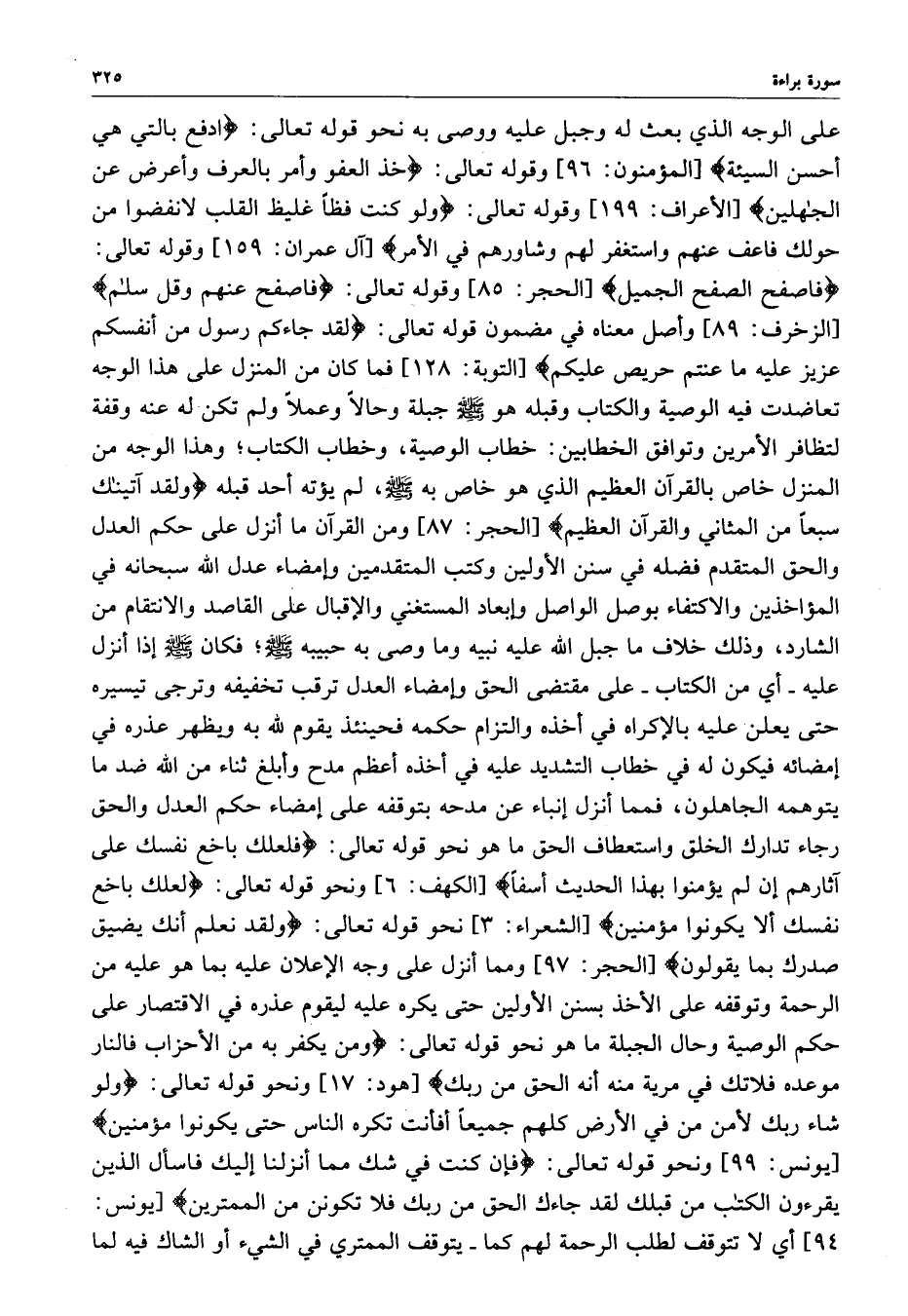 [ الحجر : 87 ] ومن القرآن ما أنزل على حكم العدل والحق المتقدم فضله في سنن الأولين وكتب المتقدمين وإمضاء عدل الله سبحانه في المؤاخذين والاكتفاء بوصل وإبعاد المستغني وإلاقبال على القاصد والانتقام من الشارد ، وذلك خلاف ما جبل الله عليه نبيه وما وصى به حبيبه ( صلى الله عليه وسلم ) ؛ فكان ( صلى الله عليه وسلم ) إذا انزل حتى يعلن عليه بالإكراه في أخذه والتزام حكمه فحينئذ يقوم لله به ويظهر عذره في إمضائه فيكون له في خطاب التشديدعليه في أخذه أعظم مدح وأبلغ ثناء من الله ضد ما يتوهمه الجاهلون ، فمما انزل إنباء عن مدحه بتوقفه على إمضاء حكم العدل والحق رجاء تدارك الخلق واسنعطاف الحق ما هو نحو قوله تعالى :