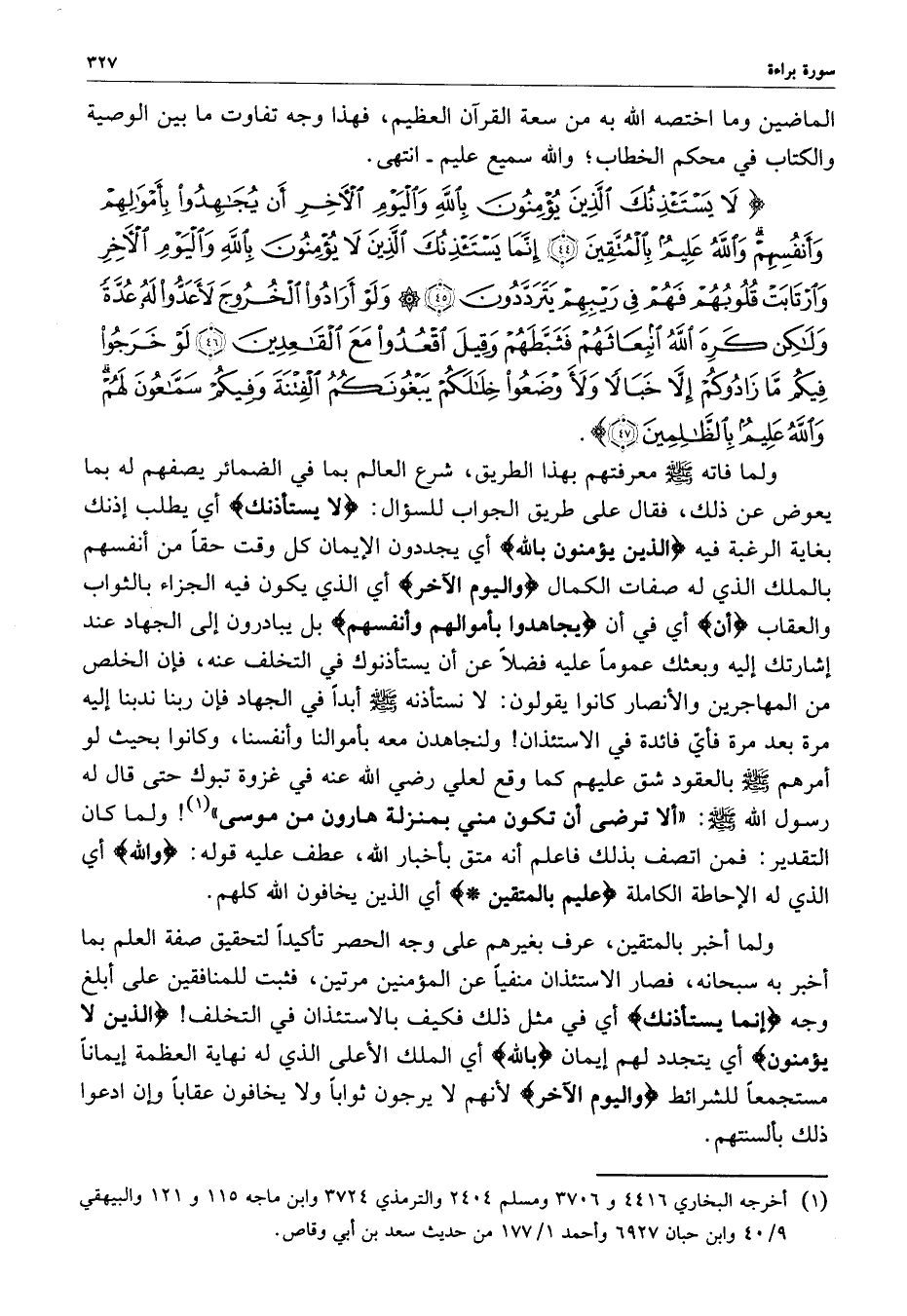 ) لاَ يَسْتَأْذِنُكَ الَّذِينَ يُؤْمِنُونَ بِاللَّهِ وَالْيَوْمِ الآخِرِ أَن يُجَاهِدُواْ بِأَمْوَالِهِمْ وَأَنْفُسِهِمْ وَاللَّهُ عَلِيمٌ بِالْمُتَّقِينَ إِنَّمَا يَسْتَأْذِنُكَ الَّذِينَ لاَ يُؤْمِنُونَ بِاللَّهِ وَالْيَوْمِ الآخِرِ وَارْتَابَتْ قُلُوبُهُمْ فَهُمْ فِي رَيْبِهِمْ يَتَرَدَّدُونَ وَلَوْ أَرَادُواْ الْخُرُوجَ لأَعَدُّواْ لَهُ عُدَّةً وَلَكِن كَرِهَ اللَّهُ انبِعَاثَهُمْ فَثَبَّطَهُمْ وَقِيلَ اقْعُدُواْ مَعَ الْقَاعِدِينَ لَوْ خَرَجُواْ فِيكُم مَّا زَادُوكُمْ إِلاَّ خَبَالاً ولأَوْضَعُواْ خِلاَلَكُمْ يَبْغُونَكُمُ الْفِتْنَةَ وَفِيكُمْ سَمَّاعُونَ لَهُمْ وَاللَّهُ عَلِيمٌ بِالظَّالِمِينَ ( ( )