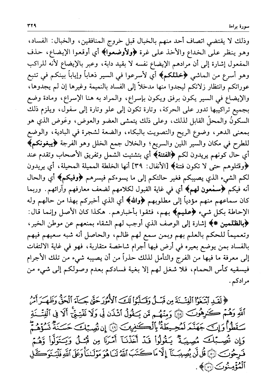 ) لَقَدِ ابْتَغَوُاْ الْفِتْنَةَ مِن قَبْلُ وَقَلَّبُواْ لَكَ الأُمُورَ حَتَّى جَآءَ الْحَقُّ وَظَهَرَ أَمْرُ اللَّهِ وَهُمْ كَارِهُونَ وَمِنْهُمْ مَّن يَقُولُ ائْذَن لِّي وَلاَ تَفْتِنِّي أَلا فِي الْفِتْنَةِ سَقَطُواْ وَإِنَّ جَهَنَّمَ لَمُحِيطَةٌ بِالْكَافِرِينَ إِن تُصِبْكَ حَسَنَةٌ تَسُؤْهُمْ وَإِن تُصِبْكَ مُصِيبَةٌ يَقُولُواْ قَدْ أَخَذْنَا أَمْرَنَا مِن قَبْلُ وَيَتَوَلَّواْ وَّهُمْ فَرِحُونَ قُل لَّن يُصِيبَنَآ إِلاَّ مَا كَتَبَ اللَّهُ لَنَا هُوَ مَوْلاَنَا وَعَلَى اللَّهِ فَلْيَتَوَكَّلِ الْمُؤْمِنُونَ ( ( )