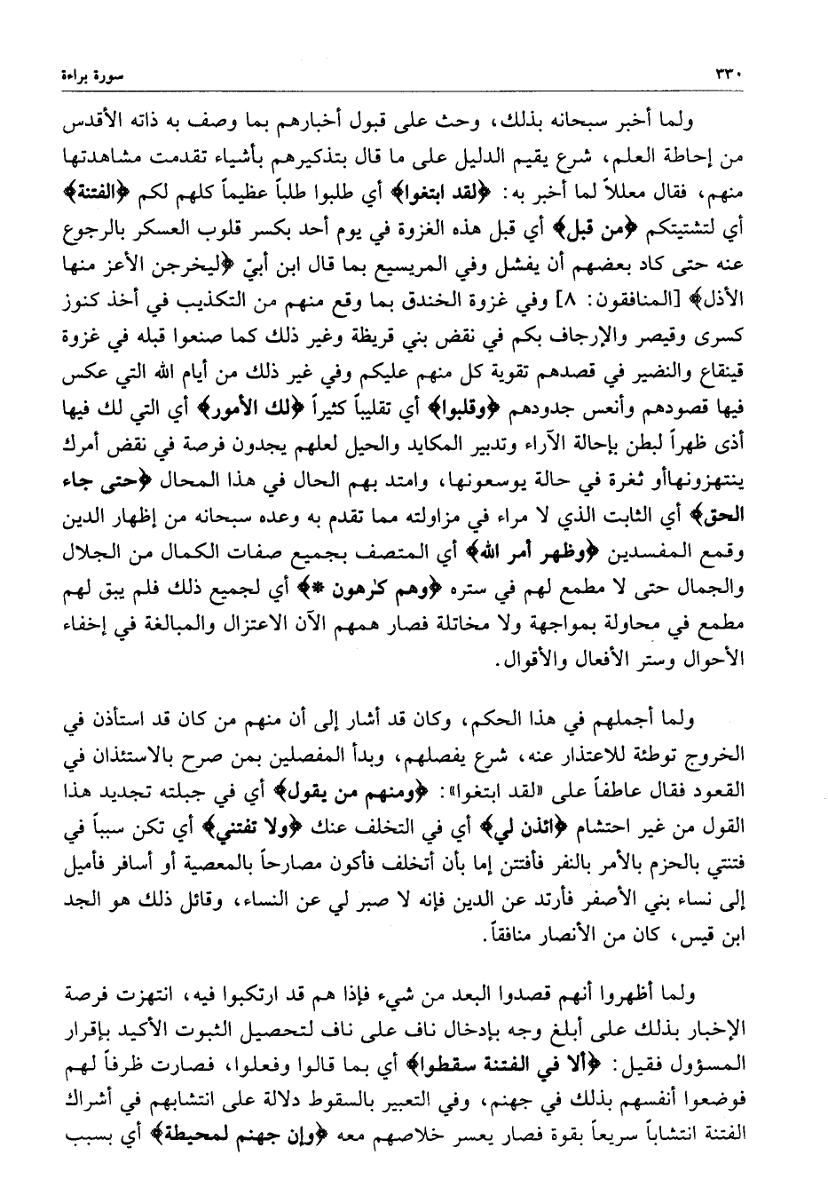 [ المنافقون : 8 ] وفي غزوة الخندق بما وقع منهم من التكذيب في أخذ كنوز كسرى وقيصر والإرجاف بكم في نقض بني قريظة وغير ذلك كما صنعوا قبله في غزوة قينقاع والنضير في قصدهم تقوية كل منهم عليكم وفي غير ذلك من ايام الله التي عكس فيها قصودهم وأنعكس جدودهم ) وقلبوا ( اي تقليباً كثيراً ) لك الأمور ) أي التي لك فيها اذى ظهراً لبطن بإحالة الآراء وتدبير المكايد والحيل لعلهم يجدون فرصة في نقض امرك ينتهزونها أو ثغرة في حالة يوسعونها ، وامتد بهم الحال في هذا المحال ) حتى جاء الحق ) أي الثابت الذي لا مراء في مزاولته مما تقدم به وعده سبحانه من إظهار الدين وقمع المفسدين ) وظهر امر الله ) أي المتصف بجميع صفات الكمال من الجلال ةالجمال حتى لا مطمع لهم في ستره ) وهم كاهرون ) أي لجميع ذلك فلم يبق لهم مطمع في محاولة بمواجهة ولا مخاتلة فصار همهم الآن الاعتزال والمبالغة في إخفاء الأحوال وستر الأفعال والأقوال .
